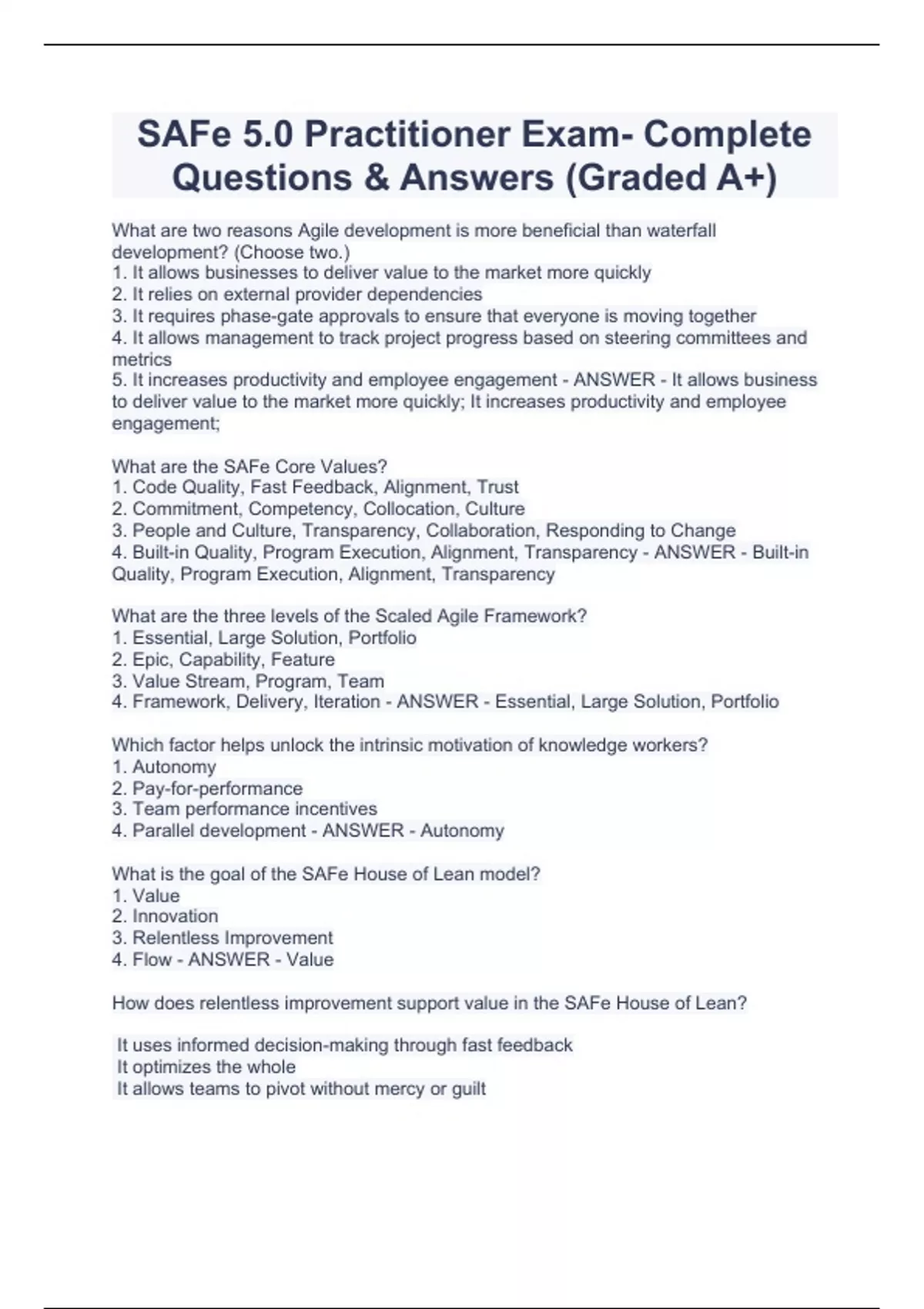 SAFe 5.0 Practitioner Exam- Complete Questions & Answers (Graded A+) SAFe 5.0 Practitioner Exam- Complete Questions & Answers (Graded A+) What are two reasons Agile development is more beneficial than waterfall development? (Choose two.) 1. It allows businesses to deliver value to the market more quickly 2. It relies on external provider dependencies 3. It requires phase-gate approvals to ensure that everyone is moving together 4. It allows management to track project progress based on steering committees and metrics 5. It increases productivity and employee engagement - ANSWER - It allows business to deliver value to the market more quickly; It increases productivity and employee engagement; What are the SAFe Core Values? 1. Code Quality, Fast Feedback, Alignment, Trust 2. Commitment, Competency, Collocation, Culture 3. People and Culture, Transparency, Collaboration, Responding to Change 4. Built-in Quality, Program Execution, Alignment, Transparency - ANSWER - Built-in Quality, Program Execution, Alignment, Transparency What are the three levels of the Scaled Agile Framework? 1. Essential, Large Solution, Portfolio 2. Epic, Capability, Feature 3. Value Stream, Program, Team 4. Framework, Delivery, Iteration - ANSWER - Essential, Large Solution, Portfolio Which factor helps unlock the intrinsic motivation of knowledge workers? 1. Autonomy 2. Pay-for-performance 3. Team performance incentives 4. Parallel development - ANSWER - Autonomy What is the goal of the SAFe House of Lean model? 1. Value 2. Innovation 3. Relentless Improvement 4. Flow - ANSWER - Value How does relentless improvement support value in the SAFe House of Lean? It uses informed decision-making through fast feedback It optimizes the whole It allows teams to pivot without mercy or guilt