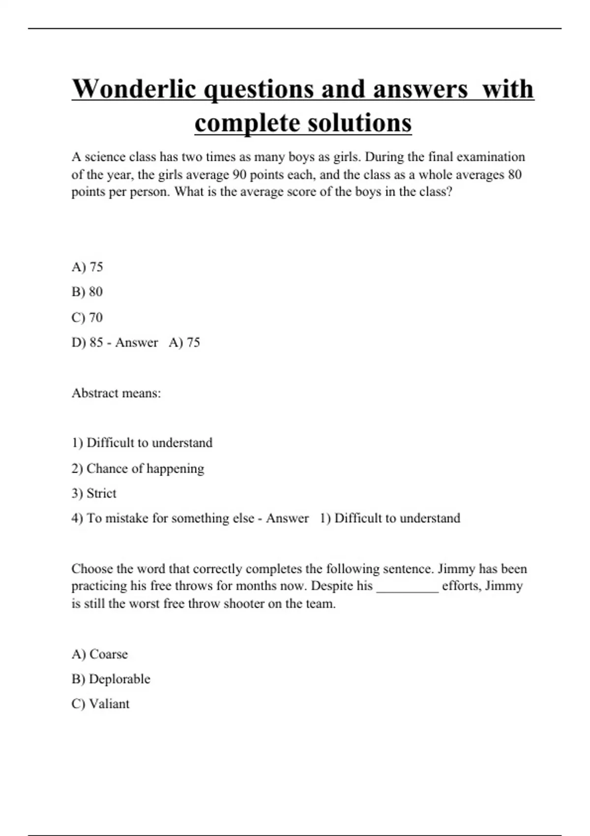 A science class has two times as many boys as girls. During the final examination of the year, the girls average 90 points each, and the class as a whole averages 80 points per person. What is the average score of the boys in the class? A) 75 B) 80 C) 70 D) 85 - Answer A) 75 Abstract means: 1) Difficult to understand 2) Chance of happening 3) Strict 4) To mistake for something else - Answer 1) Difficult to understand Choose the word that correctly completes the following sentence. Jimmy has been practicing his free throws for months now. Despite his _________ efforts, Jimmy is still the worst free throw shooter on the team. A) Coarse B) Deplorable C) Valiant D) Hard-earned - Answer C) Valiant Valiant: possessing or showing courage or determination Notebooks sell for 33 cents per unit. How much will 5 notebooks cost?
