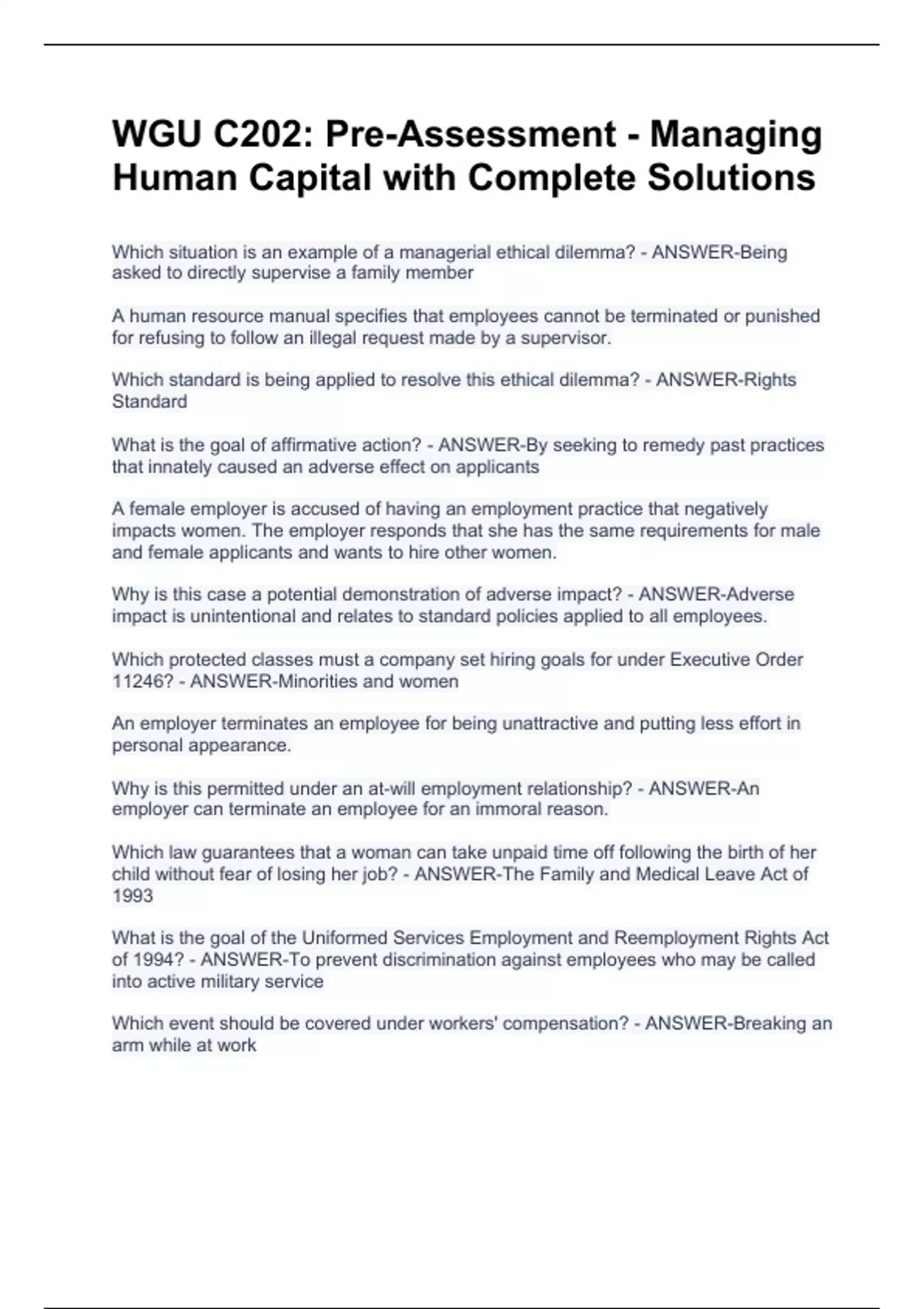 WGU C202: Pre-Assessment - Managing Human Capital with Complete Solutions