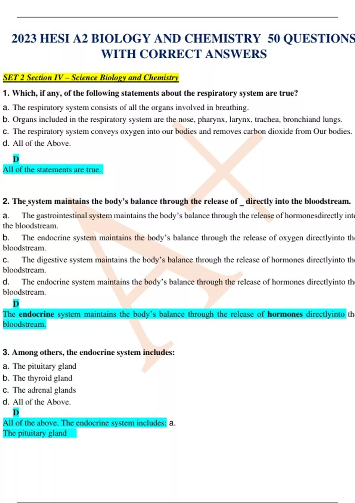 2023 HESI A2 BIOLOGY AND CHEMISTRY 50 QUESTIONS WITH CORRECT ANSWERS SET 2 Section IV – Science Biology and Chemistry 1. Which, if any, of the following statements about the respiratory system are true? a. The respiratory system consists of all the organs involved in breathing. b. Organs included in the respiratory system are the nose, pharynx, larynx, trachea, bronchiand lungs. c. The respiratory system conveys oxygen into our bodies and removes carbon dioxide from Our bodies. d. All of the Above. D All of the statements are true. 2. The system maintains the body’s balance through the release of directly into the bloodstream. a. The gastrointestinal system maintains the body’s balance through the release of hormonesdirectly into the bloodstream. b. The endocrine system maintains the body’s balance through the release of oxygen directlyinto the bloodstream. c. The digestive system maintains the body’s balance through the release of hormones directlyinto the bloodstream. d. The endocrine system maintains the body’s balance through the release of hormones directlyinto the bloodstream. D The endocrine system maintains the body’s balance through the release of hormones directlyinto the bloodstream. 3. Among others, the endocrine system includes: a. The pituitary gland b. The thyroid gland c. The adrenal glands d. All of the Above. D All of the above. The endocrine system includes: a. The pituitary gland b. The thyroid gland c. The adrenal glands 4. are contractile organs that cause movement when stimulated; the threetypes are , , and . a. Muscles are expansion organs that cause movement when stimulated; the three types aresmooth, cardiac, and skeletal. b. Muscles are contractile organs that cause movement when stimulated; the three types aresmooth, cardiac, and skeletal. c. Muscles are contractile organs that cause movement when stimulated; the three types are semipermeable, cardiac, and skeletal. d. Muscles are contractile organs that cause movement when stimulated; the three types are respiratory, cardiac, and skeletal. B Muscles are contractile organs that cause movement when stimulated; the three types are smooth, cardiac, and skeletal. 5. Which of the following is not a function of the skeletal system? a. Providing the shape and form of our bodies b. Supporting and protecting the body c. Producing Blood d. Storing vitamins D Storing vitamins is not a function of the skeletal system. 6. What is the number of bones included in the human skeletal system? a. 412 b. 103 c. Over 300 d. 206 D There are 206 bones in the skeletal system.