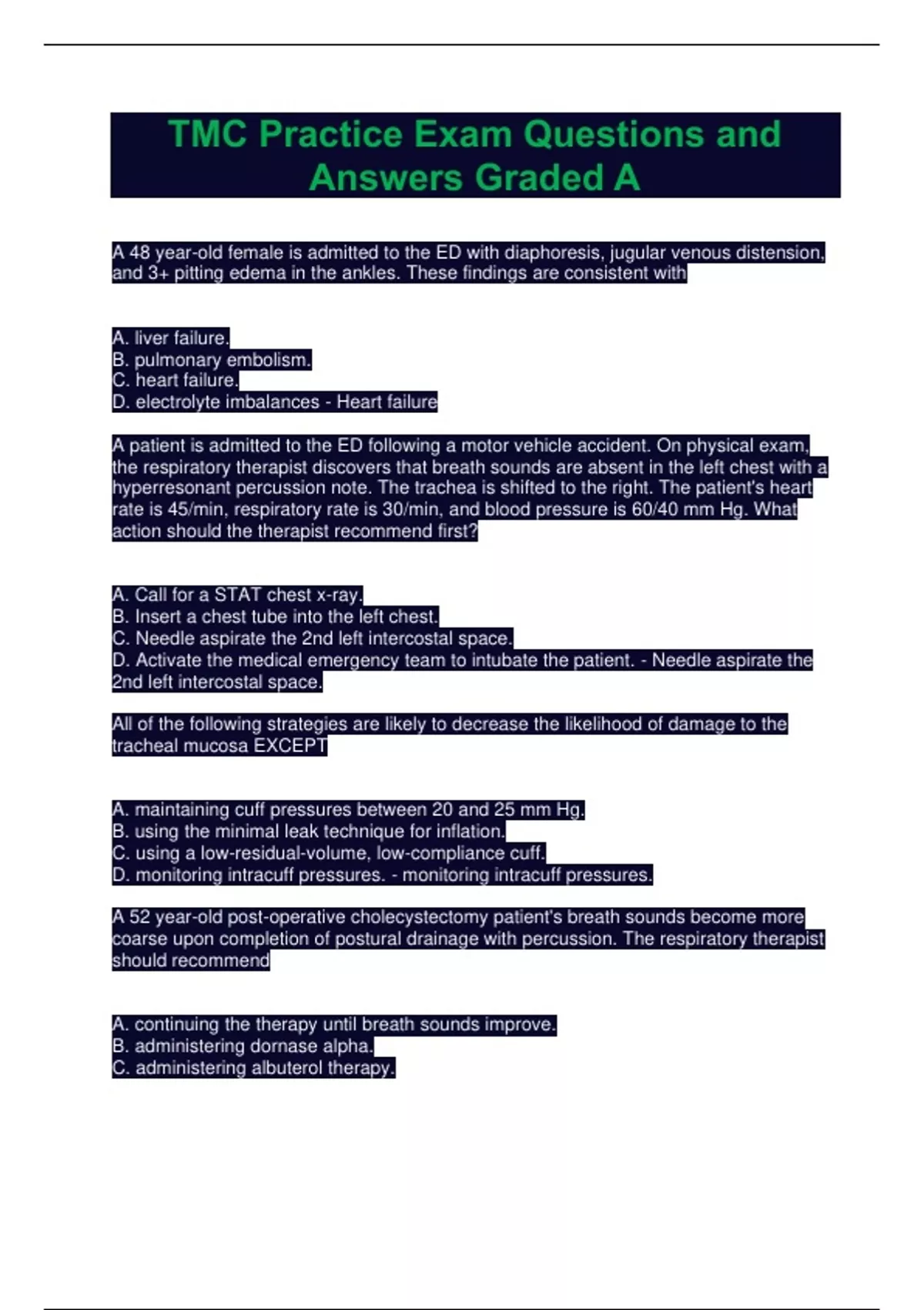 A 48 year-old female is admitted to the ED with diaphoresis, jugular venous distension, and 3+ pitting edema in the ankles. These findings are consistent with A. liver failure. B. pulmonary embolism. C. heart failure. D. electrolyte imbalances - Heart failure A patient is admitted to the ED following a motor vehicle accident. On physical exam, the respiratory therapist discovers that breath sounds are absent in the left chest with a hyperresonant percussion note. The trachea is shifted to the right. The patient's heart rate is 45/min, respiratory rate is 30/min, and blood pressure is 60/40 mm Hg. What action should the therapist recommend first? A. Call for a STAT chest x-ray. B. Insert a chest tube into the left chest. C. Needle aspirate the 2nd left intercostal space. D. Activate the medical emergency team to intubate the patient. - Needle aspirate the 2nd left intercostal space. All of the following strategies are likely to decrease the likelihood of damage to the tracheal mucosa EXCEPT A. maintaining cuff pressures between 20 and 25 mm Hg. B. using the minimal leak technique for inflation. C. using a low-residual-volume, low-compliance cuff. D. monitoring intracuff pressures. - monitoring intracuff pressures. A 52 year-old post-operative cholecystectomy patient's breath sounds become more coarse upon completion of postural drainage with percussion. The respiratory therapist should recommend A. continuing the therapy until breath sounds improve. B. administering dornase alpha. C. administering albuterol therapy. D. deep breathing and coughing to clear secretions. - deep breathing and coughing to clear secretions. A 65 kg spinal cord injured patient has developed atelectasis. His inspiratory capacity is 30% of his predicted value. What bronchial hygiene therapy would be most appropriate initially? A. IS / SMI B. IPPB with normal saline C. postural drainage and percussion D. PEP therapy - IPPB with normal saline A patient on VC ventilation has demonstrated auto-PEEP on ventilator graphics. Which of the following controls, when adjusted independently, would increase expiratory time? 1. Tidal volume 2. Respiratory Rate 3. Inspiratory flow 4. Sensitivity - 1, 2, and 3 only Which of the following would be the most appropriate therapy for a dyspneic patient who has crepitus with tracheal deviation to the left and absent breath sounds on the right? A. Perform chest physiotherapy B. Administer an IPPB treatment C. Insert an endotracheal tube D. Insert a chest tube - Insert a chest tube A 55 year-old post cardiac surgery patient has the following ABG results: pH 7.50, PaCO2 30 torr, PaO2 62 torr, HCO3 25 mEq/L, SaO2 92%, HB 14 g/dL, BE +2. Venous blood gas results are pH 7.39, PvCO2 43 torr, PvO2 37 torr, and SvO2 66%. Calculate the patient's C(a-v)O2. A. 2.5 vol% B. 4.0 vol% C. 5.0 vol% D. 5.5 vol% - 5.0 vol% A patient on VC, SIMV with a VT of 500 mL has a PIP of 25 cm H2O, Pplat of 15 cm H2O and PEEP of 5 cm H2O. What is the patient's static lung compliance A. 25 mL/cm H2O B. 35 mL/cm H2O C. 45 mL/cm H2O D. 50 mL/cm H2O - 50 mL/cm H2O Immediately after extubation of a patient in the ICU, the respiratory therapist observes increasing respiratory distress with intercostal retractions and marked stridor. The SpO2 on 40% oxygen is noted to be 86%. Which of the following would be most appropriate at this time? A. cool mist aerosol treatment B. aerosolized racemic epinephrine C. manual ventilation with resuscitation bag and mask D. reintubation - reintubation Which of the following patients would most likely benefit from pressure support ventilation? A. An intubated patient with an absent respiratory drive. B. A patient on SIMV with a set rate of 12/min and total rate of 24/min. C. A patient with acute lung injury. D. A patient who requires short-term post-operative ventilatory support. - A patient on SIMV with a set rate of 12/min and total rate of 24/min. A patient receiving mechanical ventilation has developed a temperature of 99.9° F with purulent secretions over the last 12 hours. The respiratory therapist has also noted a steady increase in peak inspiratory pressure. What initial recommendation should be made to address these changes? A. Initiate bronchial hygiene therapy. B. Obtain a sputum gram stain. C. Administer IPV. D. Insert a CASS tube. - Obtain a sputum gram stain. Which of the following information may be obtained from a FVC maneuver during bedside pulmonary function testing? 1. FEV1 2. PEFR 3. FRC 4. RV - 1 and 2 only The respiratory therapist is providing patient education for a patient who is being discharged home on aerosol therapy. The most important reason for the patient to follow the recommended cleaning procedures using a vinegar/water solution is that this solution will A. sterilize the equipment. B. retard bacterial growth. C. kill all micro-organisms and spores. D. extend the equipment life. - Retard bacterial growth A patient who complains of dyspnea is noted to have a dry, non-productive cough. On physical examination, breath sounds are diminished on the right, tactile fremitus is decreased and there is dullness to percussion over the right lower lobe. The respiratory therapist should suspect that the patient is suffering from A. pneumonia. B. pulmonary embolism. C. pleural effusion. D. bronchiolitis. - pleural effusion Which of the following suction catheters would be appropriate to use for a patient with a size 8.0 mm ID endotracheal tube? A. 8 Fr B. 10 Fr C. 12 Fr D. 14 Fr - 12 Fr A patient who is receiving continuous mechanical ventilation is fighting the ventilator. His breath sounds are markedly diminished on the left, there is dullness to percussion on the left, and the trachea is shifted to the left. The most likely explanation for the problem is that A. the patient is disconnected from the ventilator. B. the patient is experiencing diffuse bronchospasm. C. the endotracheal tube has slipped into the right main stem bronchus. D. the patient has developed a left