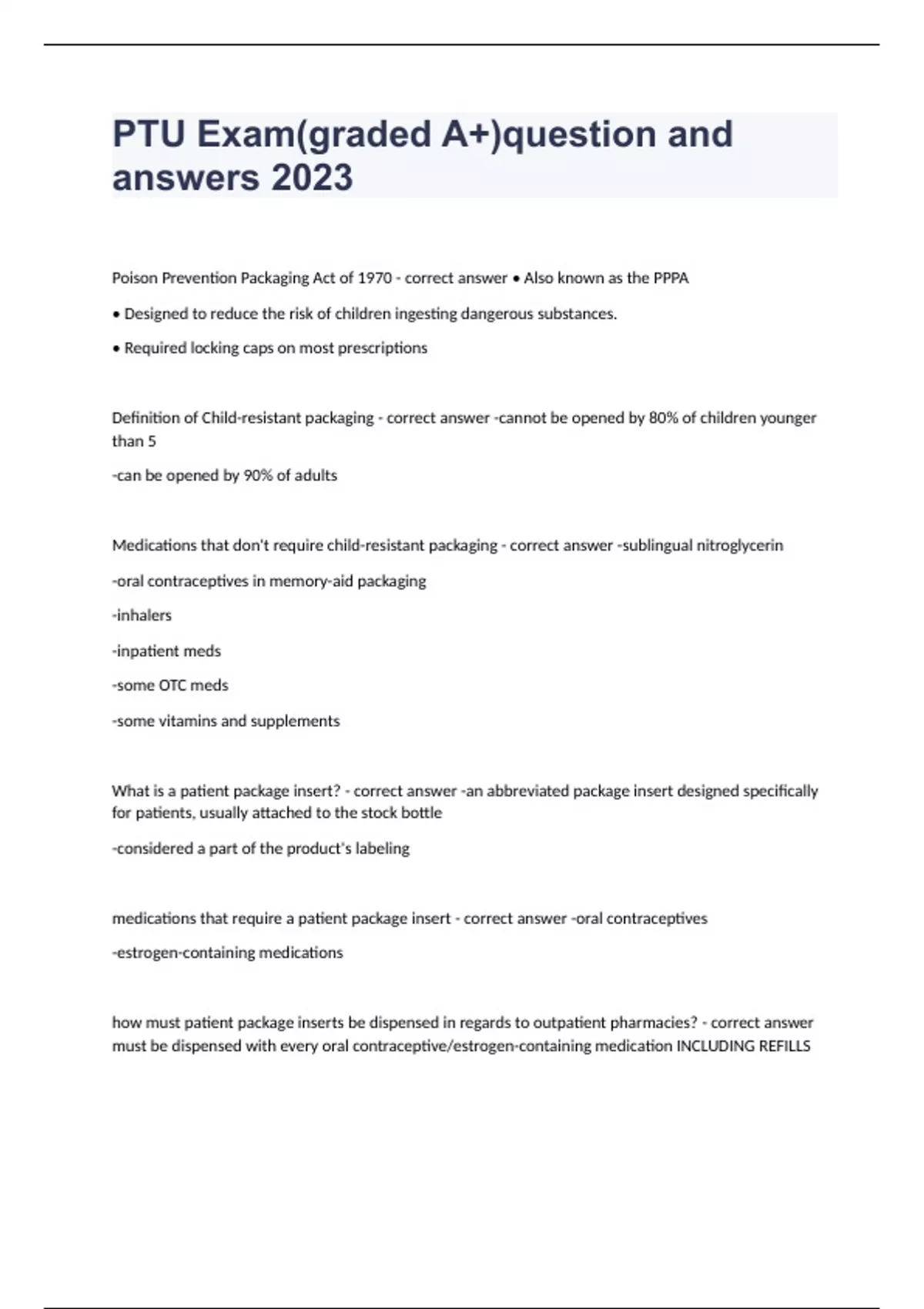 PTU Exam(graded A+)question and answers 2023Poison Prevention Packaging Act of 1970 - correct answer • Also known as the PPPA • Designed to reduce the risk of children ingesting dangerous substances. • Required locking caps on most prescriptions Definition of Child-resistant packaging - correct answer -cannot be opened by 80% of children younger than 5 -can be opened by 90% of adults Medications that don't require child-resistant packaging - correct answer -sublingual nitroglycerin -oral contraceptives in memory-aid packaging -inhalers -inpatient meds -some OTC meds -some vitamins and supplements What is a patient package insert? - correct answer -an abbreviated package insert designed specifically for patients, usually attached to the stock bottle -considered a part of the product's labeling medications that require a patient package insert - correct answer -oral contraceptives -estrogen-containing medications how must patient package inserts be dispensed in regards to outpatient pharmacies? - correct answer must be dispensed with every oral contraceptive/estrogen-containing medication INCLUDING REFILLS