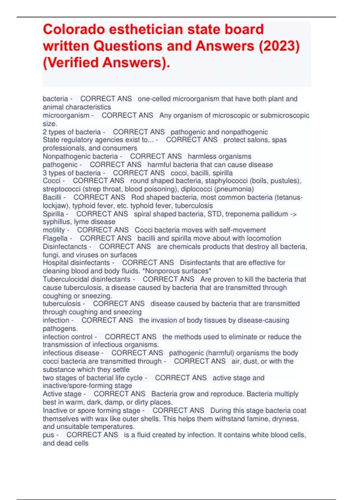 Colorado esthetician state board written Questions and Answers (2023) (Verified Answers).