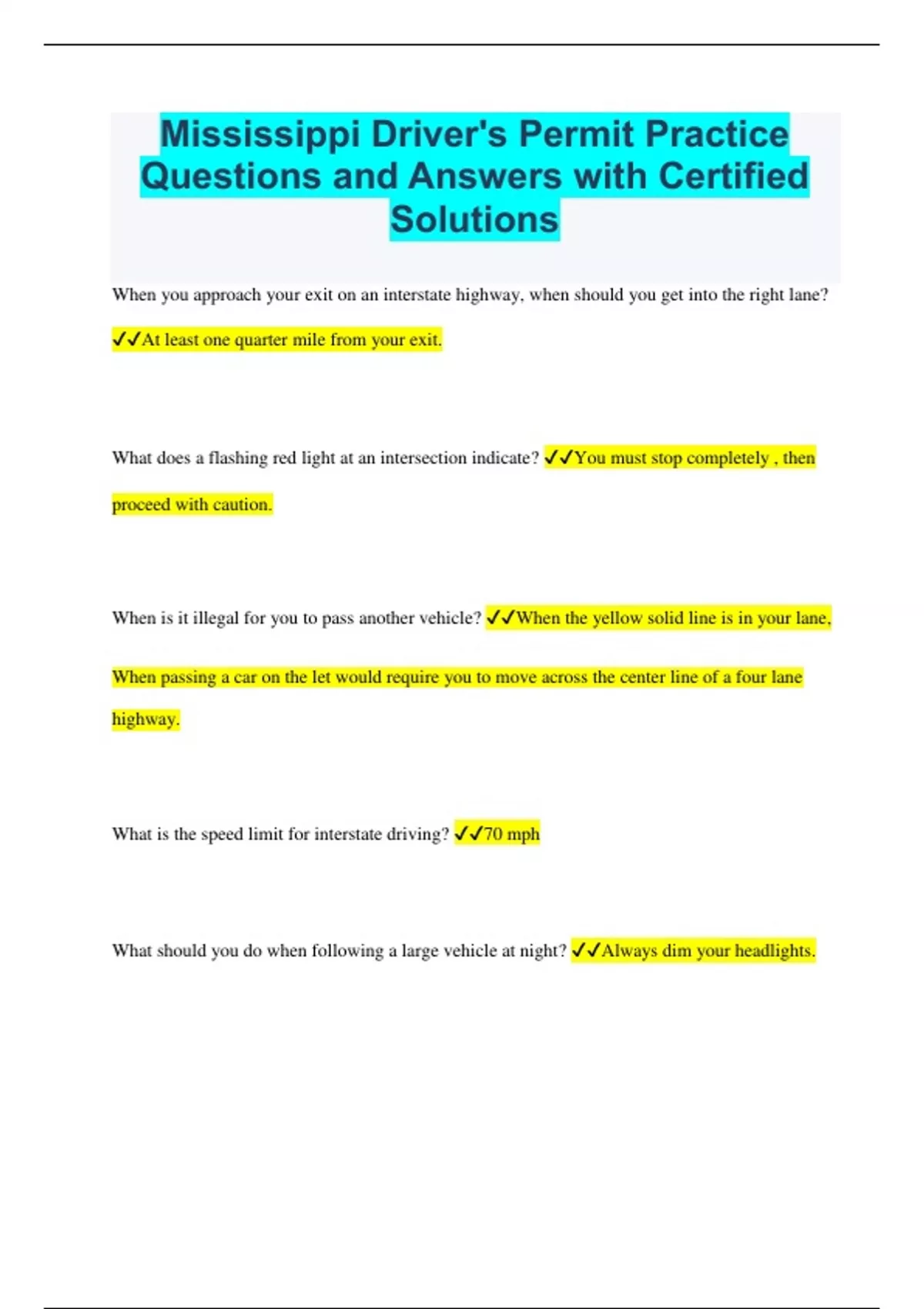 Mississippi Driver's Permit Practice Questions and Answers with Certified Solutions When you approach your exit on an interstate highway, when should you get into the right lane? At least one quarter mile from your exit. What does a flashing red light at an intersection indicate? You must stop completely , then proceed with caution. When is it illegal for you to pass another vehicle? When the yellow solid line is in your lane, When passing a car on the let would require you to move across the center line of a four lane highway. What is the speed limit for interstate driving? 70 mph What should you do when following a large vehicle at night? Always dim your headlights. When parallel parking, how far away from the curb should you park your car? Within 12 inches of the curb If your vehicle starts to skid, what should you do? Turn you wheel in the direction of the skid, if you can do so without running off the road or hitting something. What should you do if you develop a flat tire or have a blowout? Take your foot off the accelerator, Apply the brakes slowly and cautiously. Where do more accidents occur than anywhere else? Intersections A double, solid-white line on the pavement indicates what? Travel in the same direction is permitted, Crossing the line is forbidden. When may you drive off of the paved roadway to pass another vehicle? Under no circumstances Under Mississippi law, when must a child use a booster seat? If the child is between the ages of 4 and 7. Measures less than 4ft. 9in. in height, weighs less than 65 pounds. When passing a large vehicle on the highway, what must you be sure to see before you move back into your lane. The front wheels of the truck meeting the pavement in your rear view mirror. If you use a tarpaulin , canvas, or cover of any kind, what must you do? Secure it soundly so that no end, string or binding flaps as the truck moves down the roadway. No single vehicle, loaded or unloaded may have an overall length in excess of? 40 feet, including both front and rear bumpers. Under what circumstances can you stop and park your car within 10 feet of a fire hydrant? If it's necessary to avoid conflict with other traffic or traffic-control devices. Children weighing up to 20 pounds should be transported how? In a rear-facing child safety seat What are round road signs used for? Railroad advance warning signs. If you meet a vehicle at night with bright or blinding headlights, what is the safest thing to do? Dim your lights, Keep your eyes on the right side of the road. What is exempt from size, weight, and height limitations when operated during daylight hours on any state highway within 50 miles of the point of origin? Farm Machinery When should you stop for a school bus? You must stop for a school bus regardless of you direction whenever the bus is stopped and receiving or discharging children. When should you not pass a vehicle on the left? Within 100 feet of bridges, viaducts, overpasses, railroad crossings, crosswalks, intersections or any place where your view is obstructed in any way. At night, what happens to your visibility? It is greatly reduced What does a yellow, flashing light mean? Slow down and exercise caution before proceeding through the intersection. Braking distances are impacted by what? If the weather si bad or the road is slick If you are tired or intoxicated If you are under the age of 21 and you are found guilty of driving under the influence of alcohol, your sentence will follow the zero tolerance guidelines. What are the penalties under the zero tolerance guidelines? 1st offense, 90-day suspension and $250 fine; 2nd offense, 1-year suspension and up to $500 fine; 3rd offense, suspended until age 21 or for up to 2 years, whichever is greater and fine up to $1,000. If you witness an accident, what do the laws of Mississippi require that you do? Stop at once and help anyone who has been injured. Report immediately to the proper law enforcement authorities if the accident involves injury, death or apparent property damage exceeding $500.00. Driving Insurance And The Safety Responsibility Act: What insurance limits are required under the Safety Responsibility Act? Required insurance limits are at least $25,000 for property damage, $50,000 for any one person injured or killed and $25,000 for any two persons injured or killed. What should every motor vehicle in the state of Mississippi have in it? Insurance card as proof of liability insurance that is in compliance with the liability limits. In Mississippi, what alcohol level is considered to be too high to be legally driving if you are over the age of 21? 0.08% When an officer arrives at the scene of an accident, if you are the driver of the car, what must you provide to the officer? Proof of insurance and insurance policy number Any ambulance, fire engine or police car flashing red or blue lights or signaling with a bell always has the right-of-way on any street in any traffic situation. If an emergency vehicle approaches while you are in an intersection, what should you do? Proceed through the intersection and then pull over to the extreme right. If you are driving and need to report an emergency traffic situation to the Mississippi Highway Patrol, what number should you dial on your cell phone? *HP (*47) What is the speed limit in school zones located within city limits in the state of Mississippi? 15 mph What should you do when two or more vehicles stop at an intersection at the same time? The vehicle on the right has the right-of-way You are about to make a left turn. You must signal continuously how many feet before turn? 100 A driver with a Class C drivers license may drive what? Pick-Up Trucks When driving in fog, you should always remember to use your... Low Beams Roadways are the most slippery The first few moments of rain At intersections, crosswalks, and railroad crossings, you should always... Stop, listen, and proceed cautiously. If you move to Mississippi, you must obtain a Mississi