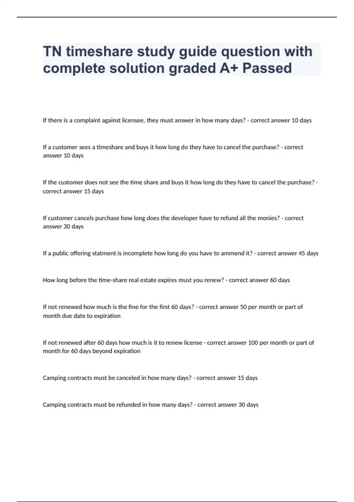 TN timeshare study guide question with complete solution graded A+ Passed If there is a complaint against licensee, they must answer in how many days? - correct answer 10 days If a customer sees a timeshare and buys it how long do they have to cancel the purchase? - correct answer 10 days If the customer does not see the time share and buys it how long do they have to cancel the purchase? - correct answer 15 days If customer cancels purchase how long does the developer have to refund all the monies? - correct answer 30 days If a public offering statment is incomplete how long do you have to ammend it? - correct answer 45 days How long before the time-share real estate expires must you renew? - correct answer 60 days If not renewed how much is the fine for the first 60 days? - correct answer 50 per month or part of month due date to expiration If not renewed after 60 days how much is it to renew license - correct answer 100 per month or part of month for 60 days beyond expiration Camping contracts must be canceled in how many days? - correct answer 15 days Camping contracts must be refunded in how many days? - correct answer 30 days