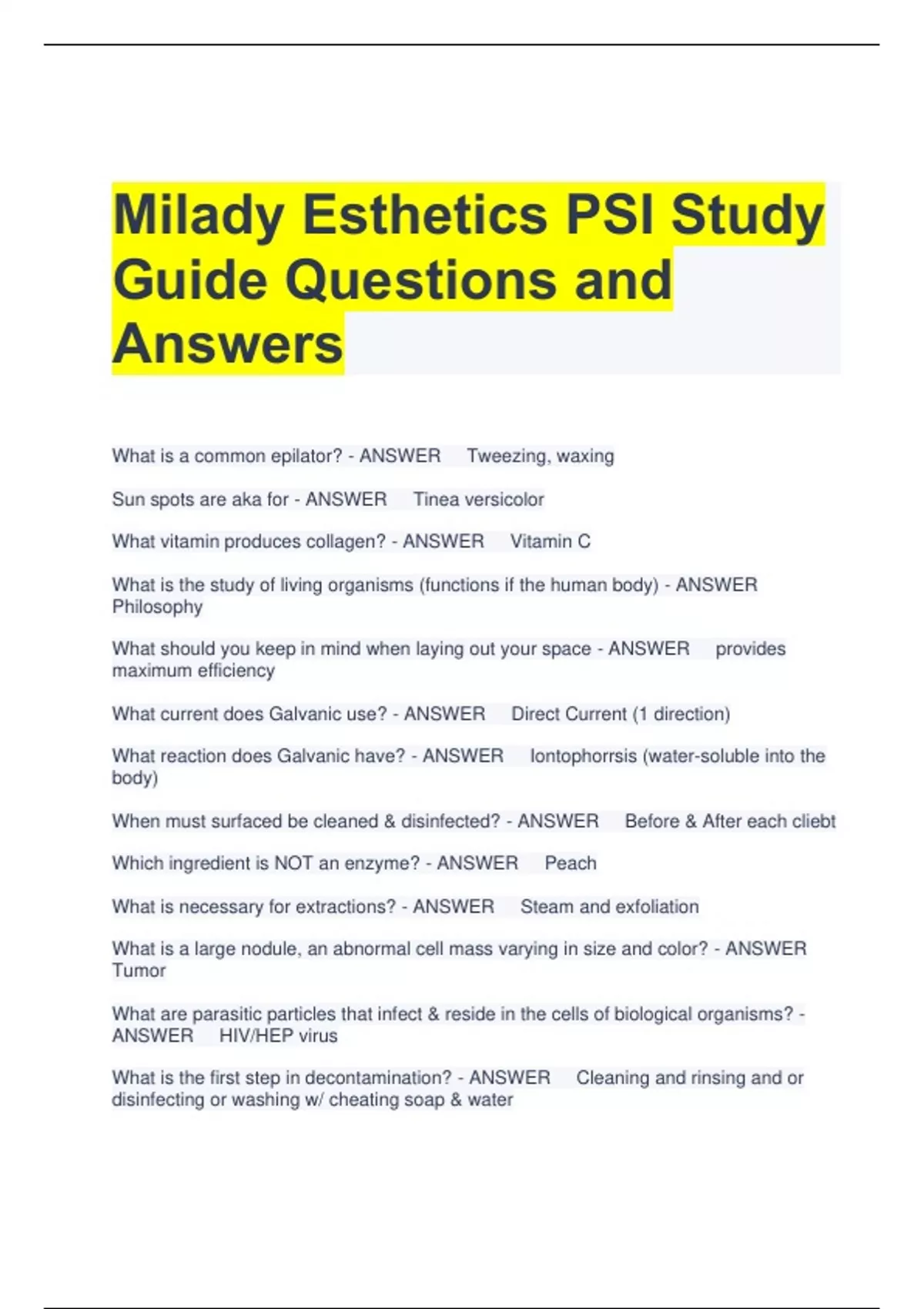 Milady Esthetics PSI Study Guide Questions and Answers What is a common epilator? - ANSWER Tweezing, waxing Sun spots are aka for - ANSWER Tinea versicolor What vitamin produces collagen? - ANSWER Vitamin C What is the study of living organisms (functions if the human body) - ANSWER Philosophy What should you keep in mind when laying out your space - ANSWER provides maximum efficiency What current does Galvanic use? - ANSWER Direct Current (1 direction) What reaction does Galvanic have? - ANSWER Iontophorrsis (water-soluble into the body) When must surfaced be cleaned & disinfected? - ANSWER Before & After each cliebt Which ingredient is NOT an enzyme? - ANSWER Peach What is necessary for extractions? - ANSWER Steam and exfoliation What is a large nodule, an abnormal cell mass varying in size and color? - ANSWER Tumor What are parasitic particles that infect & reside in the cells of biological organisms? - ANSWER HIV/HEP virus