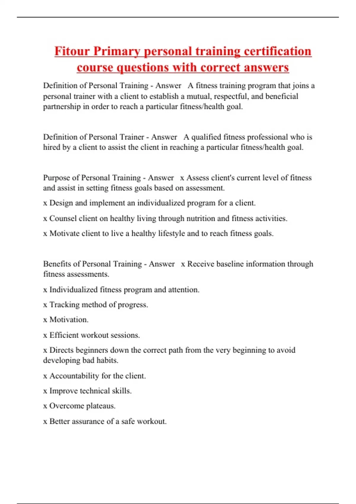 Benefits of Personal Training - Answer x Receive baseline information through fitness assessments. x Individualized fitness program and attention.