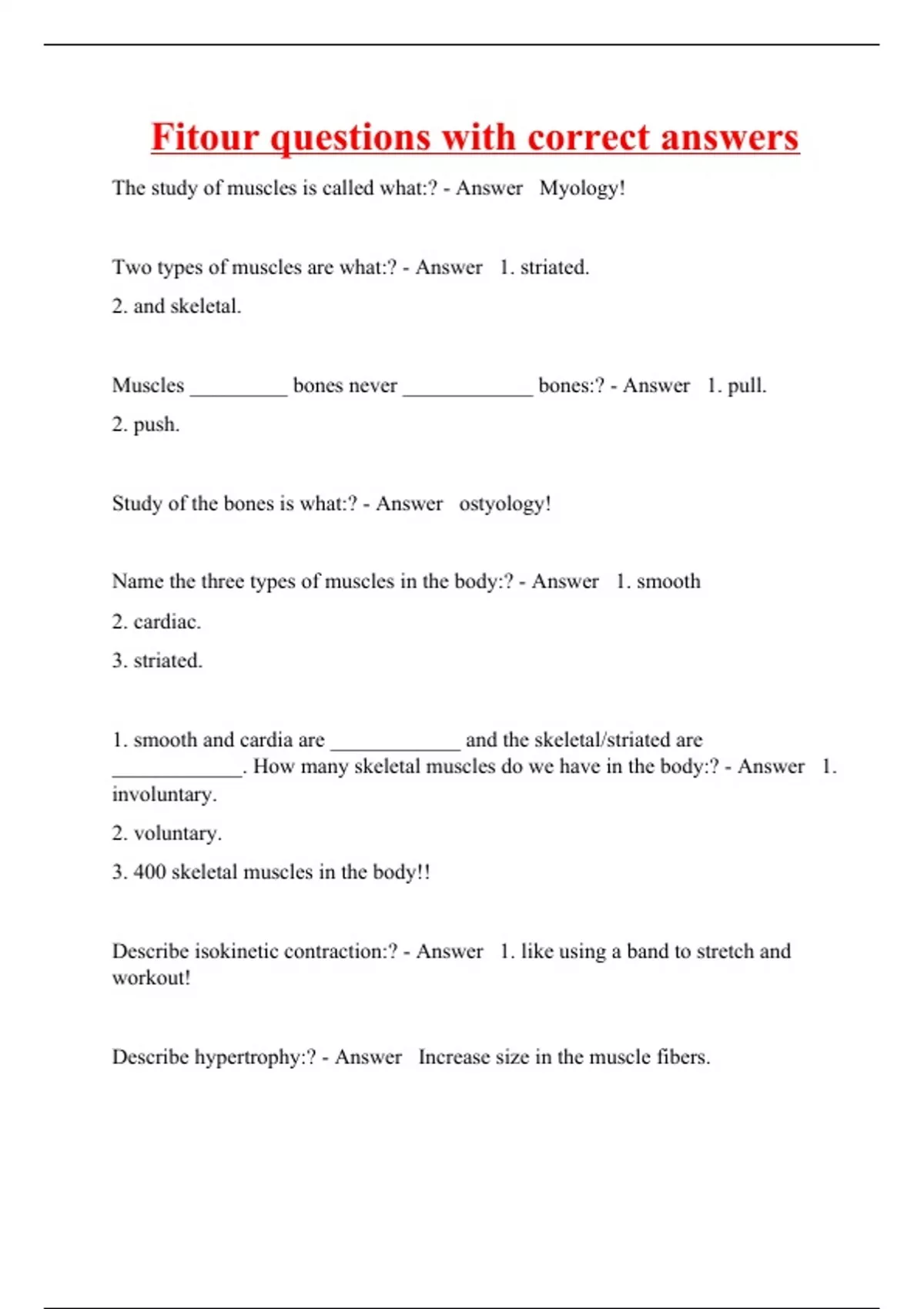 The study of muscles is called what:? - Answer Myology! Two types of muscles are what:? - Answer 1. striated. 2. and skeletal. Muscles _________ bones never ____________ bones:? - Answer 1. pull. 2. push. Study of the bones is what:? - Answer ostyology! Name the three types of muscles in the body:? - Answer 1. smooth 2. cardiac. 3. striated. 1. smooth and cardia are ____________ and the skeletal/striated are ____________. How many skeletal muscles do we have in the body:? - Answer 1. involuntary. 2. voluntary. 3. 400 skeletal muscles in the body!! Describe isokinetic contraction:? - Answer 1. like using a band to stretch and workout! Describe hypertrophy:? - Answer Increase size in the muscle fibers. Name the 3 types of muscle fibers:? - Answer 1. 1 A slow