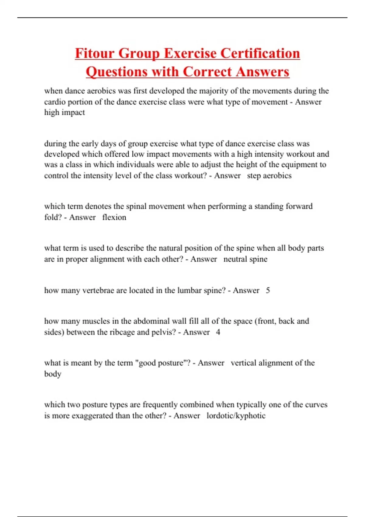 when dance aerobics was first developed the majority of the movements during the cardio portion of the dance exercise class were what type of movement - Answer high impact during the early days of group exercise what type of dance exercise class was developed which offered low impact movements with a high intensity workout and was a class in which individuals were able to adjust the height of the equipment to control the intensity level of the class workout? - Answer step aerobics which term denotes the spinal movement when performing a standing forward fold? - Answer flexion what term is used to describe the natural position of the spine when all body parts are in proper alignment with each other? - Answer neutral spine how many vertebrae are located in the lumbar spine? - Answer 5 how many muscles in the abdominal wall fill all of the space (front, back and sides) between the ribcage and pelvis? - Answer 4 what is meant by the term "good posture"? - Answer vertical alignment of the body which two posture types are frequently combined when typically one of the curves is more exaggerated than the other? - Answer lordotic/kyphotic what is the percentage of americans who