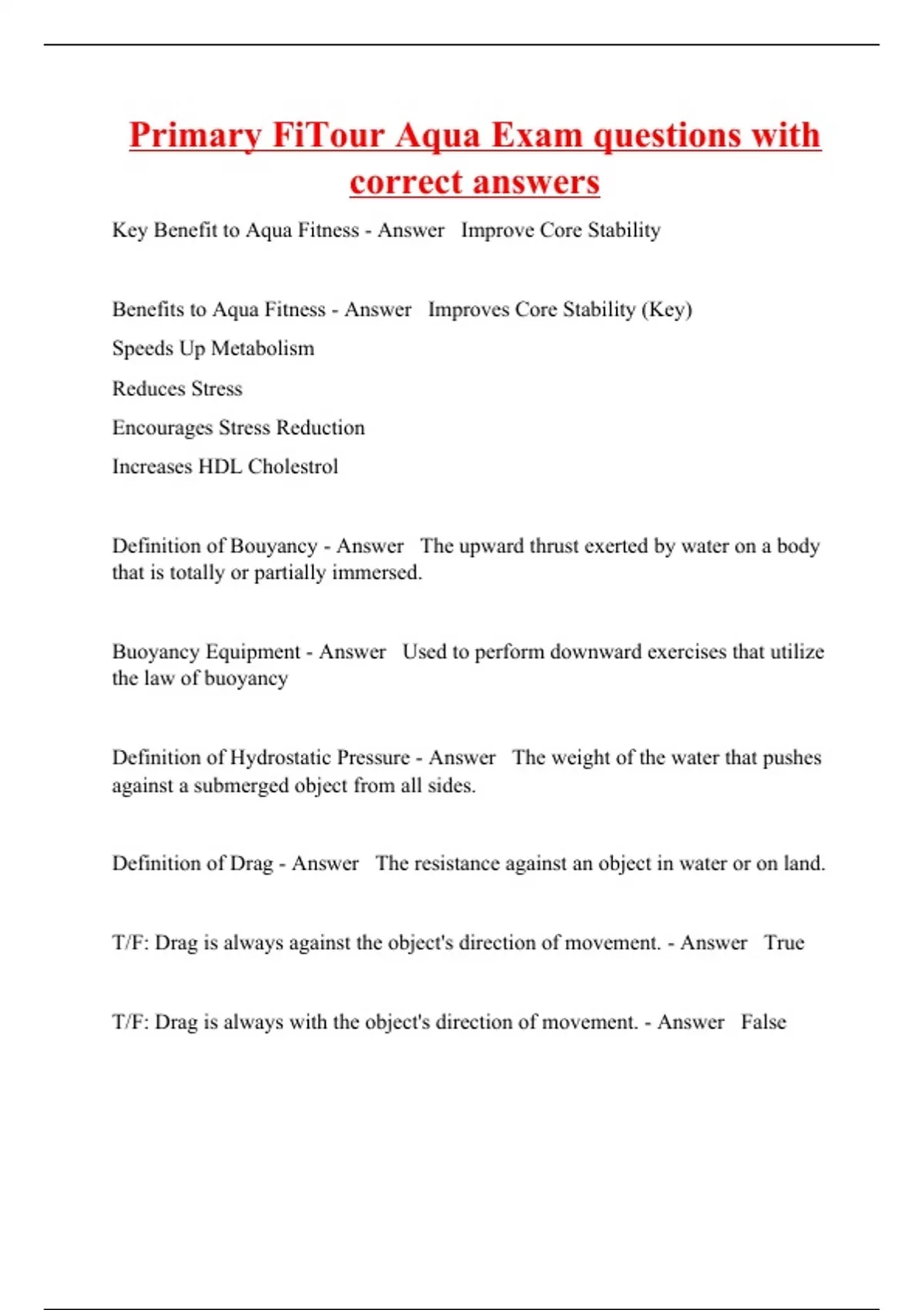 Key Benefit to Aqua Fitness - Answer Improve Core Stability Benefits to Aqua Fitness - Answer Improves Core Stability (Key) Speeds Up Metabolism Reduces Stress Encourages Stress Reduction Increases HDL Cholestrol Definition of Bouyancy - Answer The upward thrust exerted by water on a body that is totally or partially immersed. Buoyancy Equipment - Answer Used to perform downward exercises that utilize the law of buoyancy Definition of Hydrostatic Pressure - Answer The weight of the water that pushes against a submerged object from all sides. Definition of Drag - Answer The resistance against an object in water or on land. T/F: Drag is always against the object's direction of movement. - Answer True T/F: Drag is always with the object's direction of movement. - Answer False