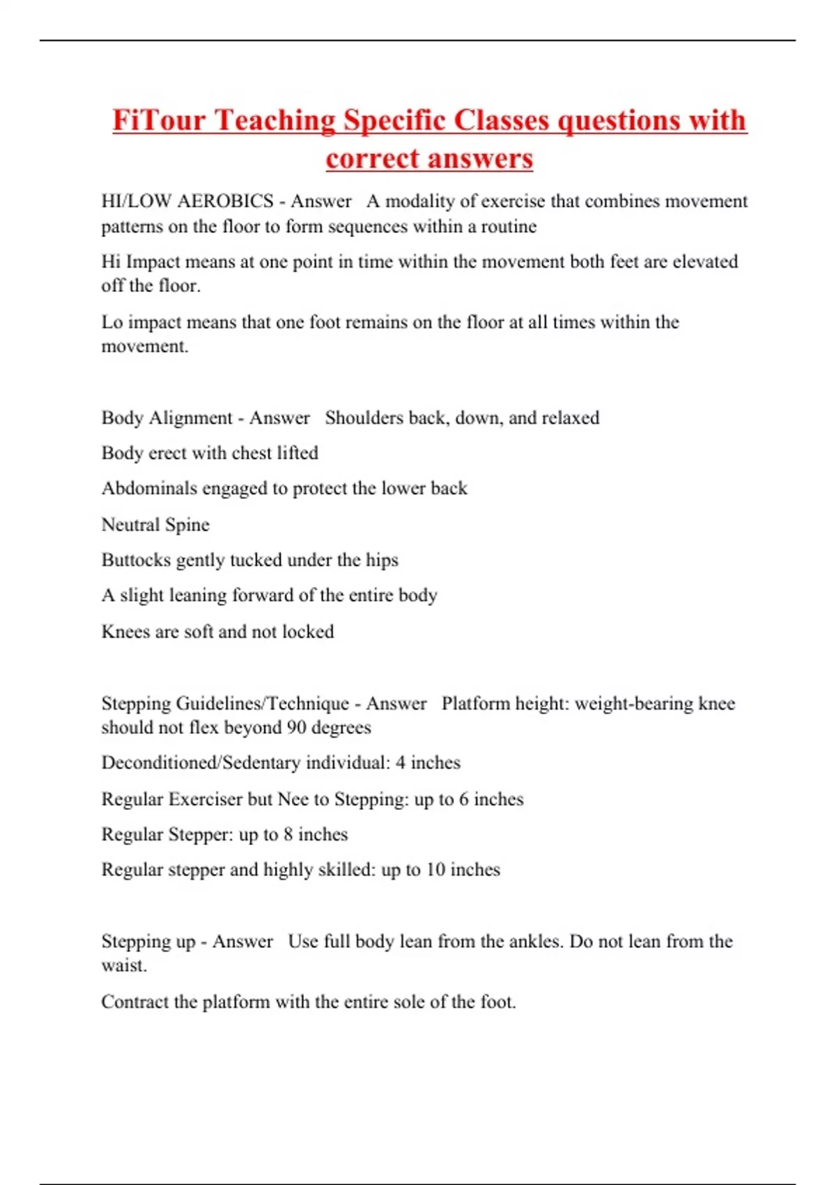 HI/LOW AEROBICS - Answer A modality of exercise that combines movement patterns on the floor to form sequences within a routine Hi Impact means at one point in time within the movement both feet are elevated off the floor. Lo impact means that one foot remains on the floor at all times within the movement. Body Alignment - Answer Shoulders back, down, and relaxed Body erect with chest lifted Abdominals engaged to protect the lower back Neutral Spine Buttocks gently tucked under the hips A slight leaning forward of the entire body Knees are soft and not locked Stepping Guidelines/Technique - Answer Platform height: weight-bearing knee should not flex beyond 90 degrees Deconditioned/Sedentary individual: 4 inches