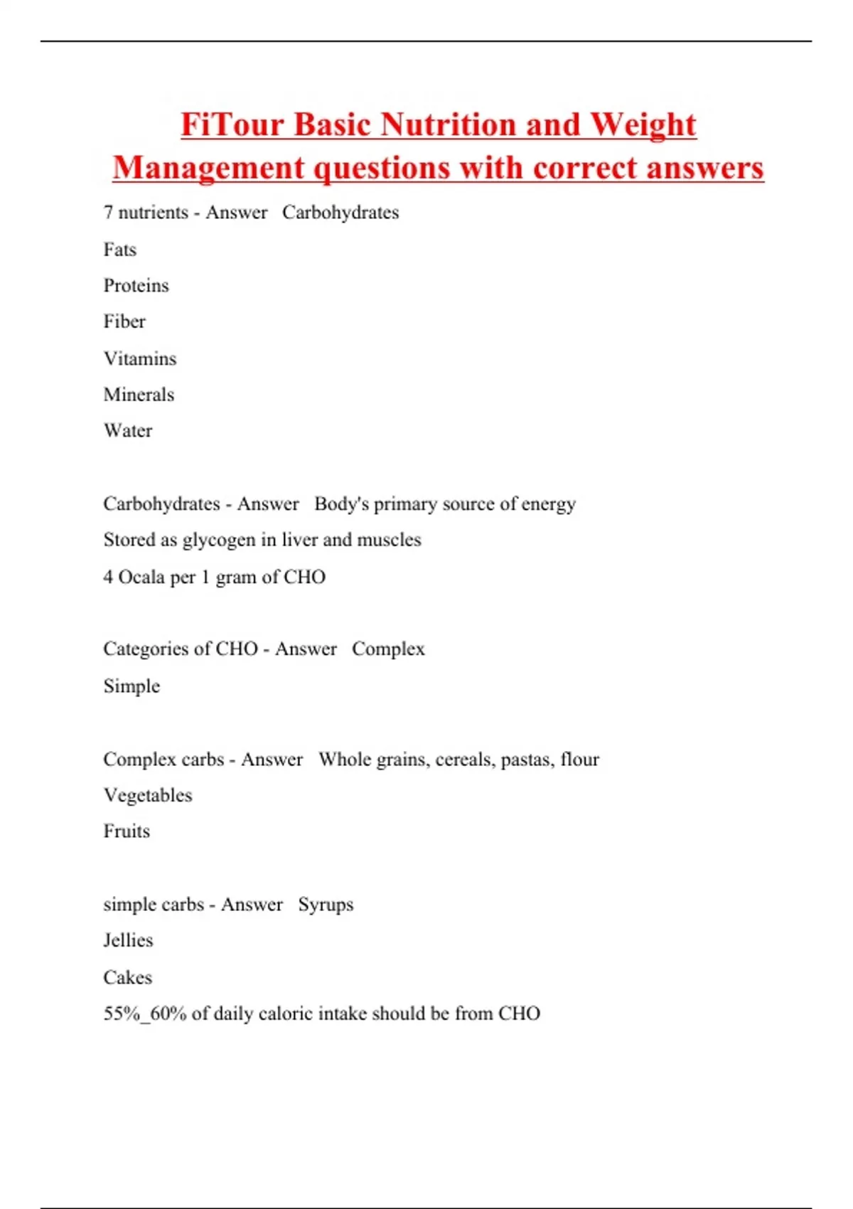 7 nutrients - Answer Carbohydrates Fats Proteins Fiber Vitamins Minerals Water Carbohydrates - Answer Body's primary source of energy Stored as glycogen in liver and muscles 4 Ocala per 1 gram of CHO Categories of CHO - Answer Complex Simple Complex carbs - Answer Whole grains, cereals, pastas, flour Vegetables Fruits simple carbs - Answer Syrups Jellies Cakes 55%_60% of daily caloric intake sho