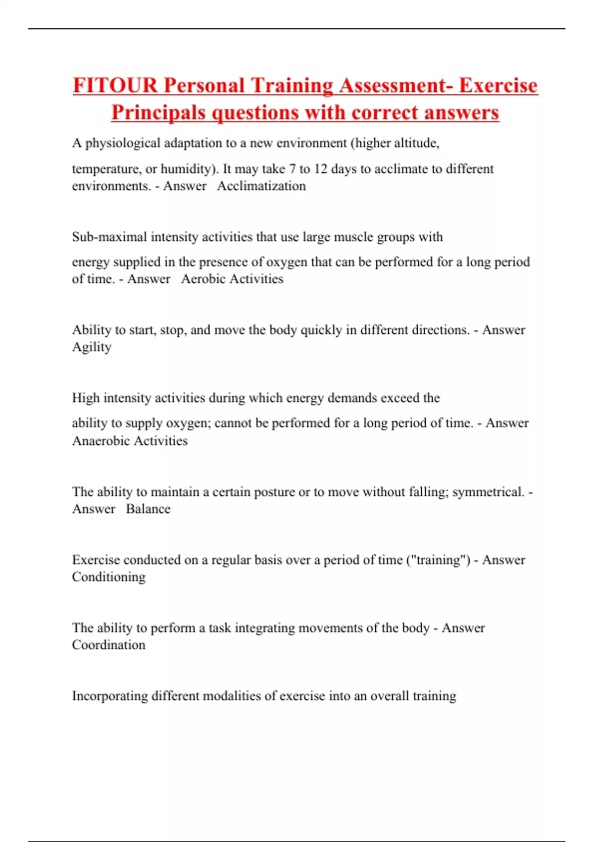 FITOUR Personal Training Assessment- Exercise Principals questions with correct answers