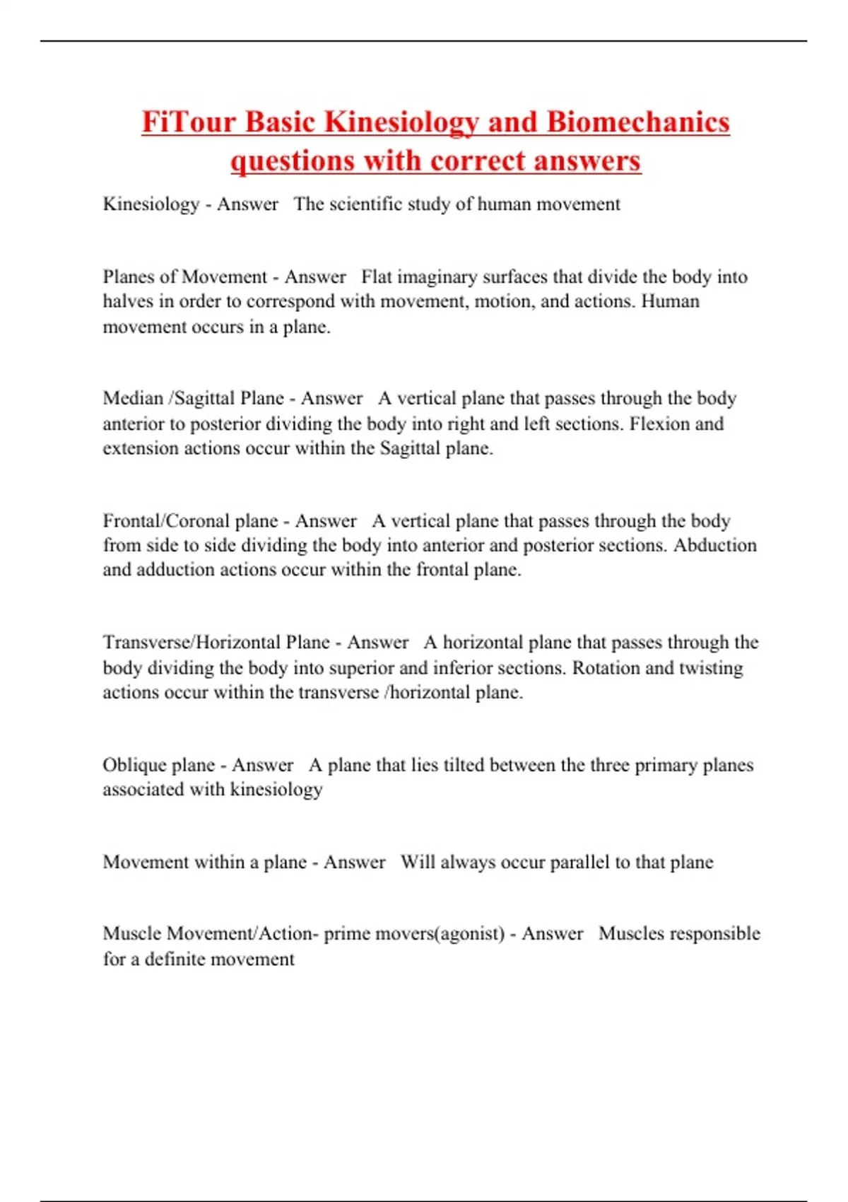 FiTour Basic Kinesiology and Biomechanics questions with correct answers