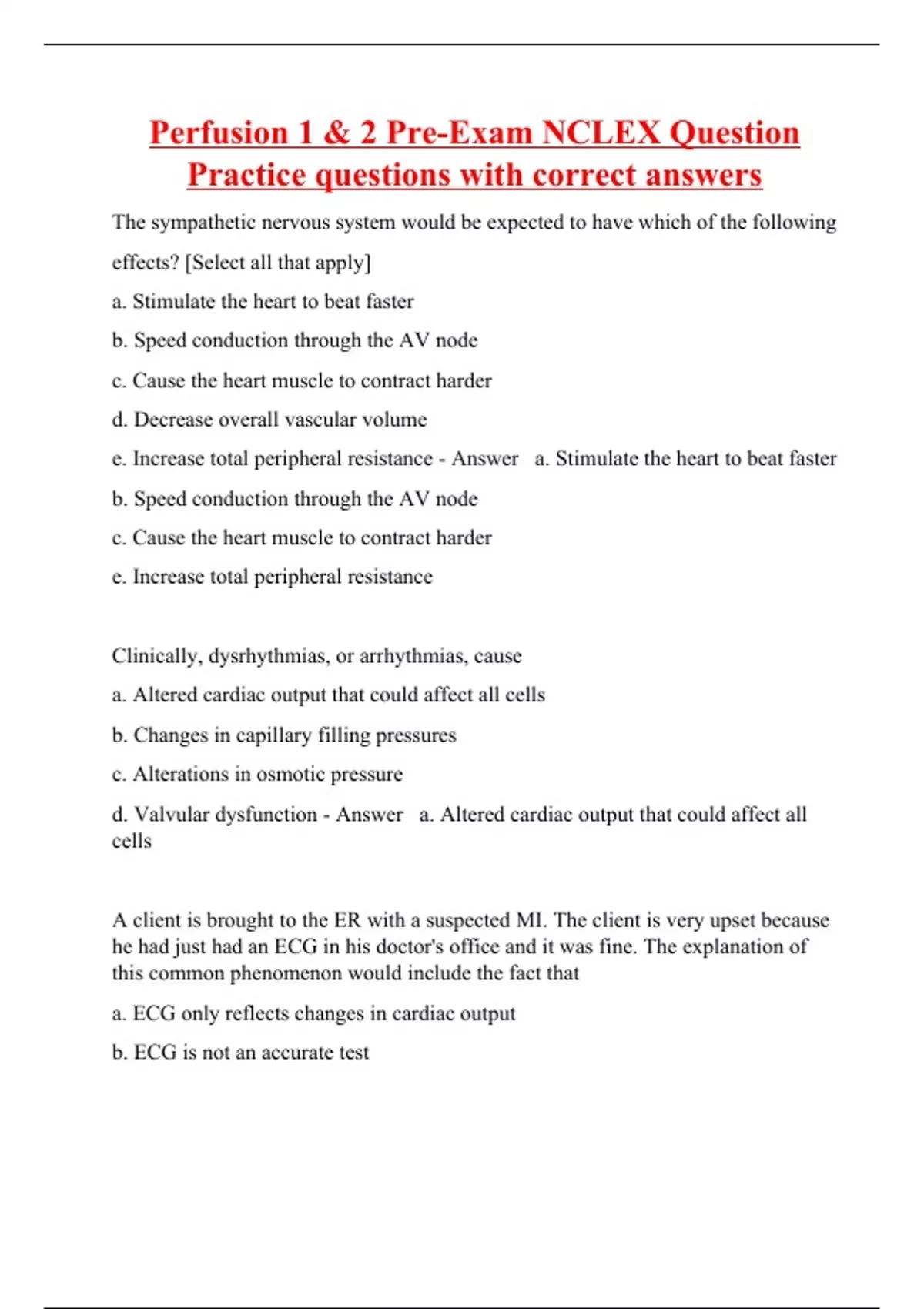 The sympathetic nervous system would be expected to have which of the following effects? [Select all that apply] a. Stimulate the heart to beat faster b. Speed conduction through the AV node c. Cause the heart muscle to contract harder d. Decrease overall vascular volume e. Increase total peripheral resistance - Answer a. Stimulate the heart to beat faster b. Speed conduction through the AV node c. Cause the heart muscle to contract harder e. Increase total peripheral resistance Clinically, dysrhythmias, or arrhythmias, cause a. Altered cardiac output that could affect all cells b. Changes in capillary filling pressures c. Alterations in osmotic pressure d. Valvular dysfunction - Answer a. Altered cardiac output that could affect all cells A client is brought to the ER with a suspected MI. The client is very upset because he had just had an ECG in his doctor's o