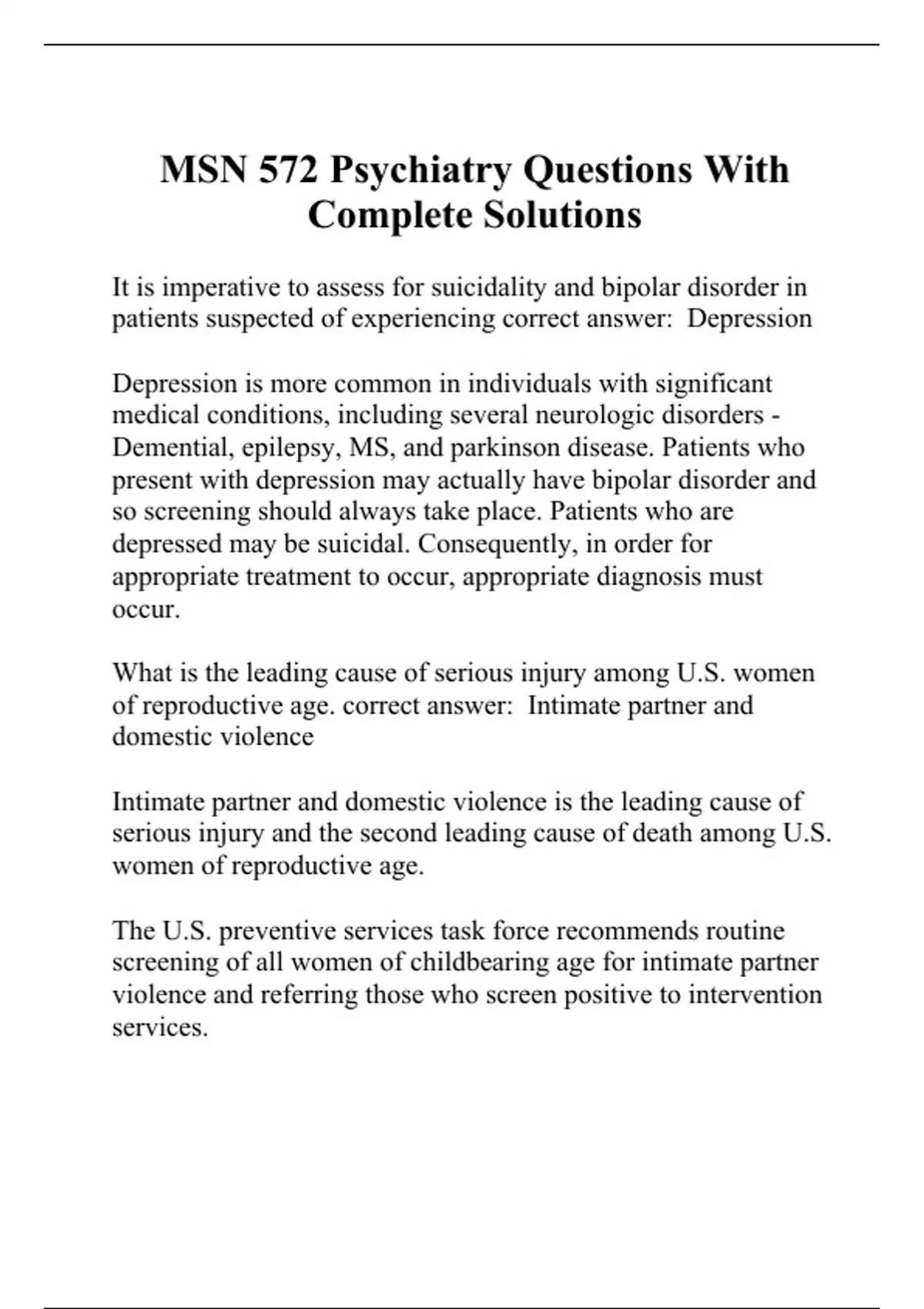 It is imperative to assess for suicidality and bipolar disorder in patients suspected of experiencing correct answer: Depression Depression is more common in individuals with significant medical conditions, including several neurologic disorders - Demential, epilepsy, MS, and parkinson disease. Patients who present with depression may actually have bipolar disorder and so screening should always take place. Patients who are depressed may be suicidal. Consequently, in order for appropriate treatment to occur, appropriate diagnosis must occur. What is the leading cause of serious injury among U.S. women of reproductive age. correct answer: Intimate partner and domestic violence Intimate partner and domestic violence is the leading cause of serious injury and the second leading cause of death among U.S. women of reproductive age. The U.S. preventive services task force recommends routine screening of all women of childbearing age for intimate partner violence and referring those who screen positive to intervention services. Which one of the following findings is not typical in a patient who has delirium? correct answer: Intact attention and concentration Delirium is an acute, abrupt-onset co