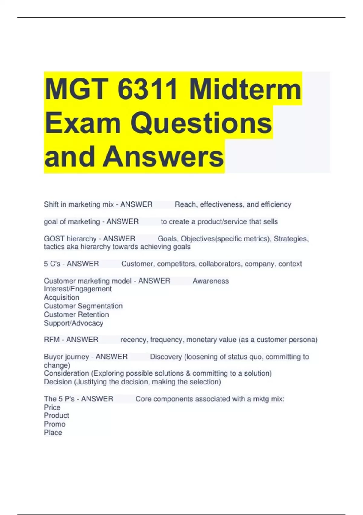 MGT 6311 Midterm Exam Questions and Answers Shift in marketing mix - ANSWER Reach, effectiveness, and efficiency goal of marketing - ANSWER to create a product/service that sells GOST hierarchy - ANSWER Goals, Objectives(specific metrics), Strategies, tactics aka hierarchy towards achieving goals 5 C's - ANSWER Customer, competitors, collaborators, company, context Customer marketing model - ANSWER Awareness Interest/Engagement Acquisition Customer Segmentation Customer Retention Support/Advocacy RFM - ANSWER recency, frequency, monetary value (as a customer persona) Buyer journey - ANSWER Discovery (loosening of status quo, committing to change) Consideration (Exploring possible solutions & committing to a solution) Decision (Justifying the decision, making the selection) The 5 P's - ANSWER Core components associated with a mktg mix: Price Product Promo Place People Porter's 5 forces - ANSWER designed to consider competitive implications for an org within context of consumer behavior. Power of customer, threat of new entrants, threat of substitutes, power of supplies - All circle into: competitive rivalry within industry 4 components to define a holistic strategy - ANSWER 1. define the mission behind dig. mktg efforts 2. derive the digital strategy 3. define the interaction strategy across cust. lifestyle 4. measurement & improve ROI