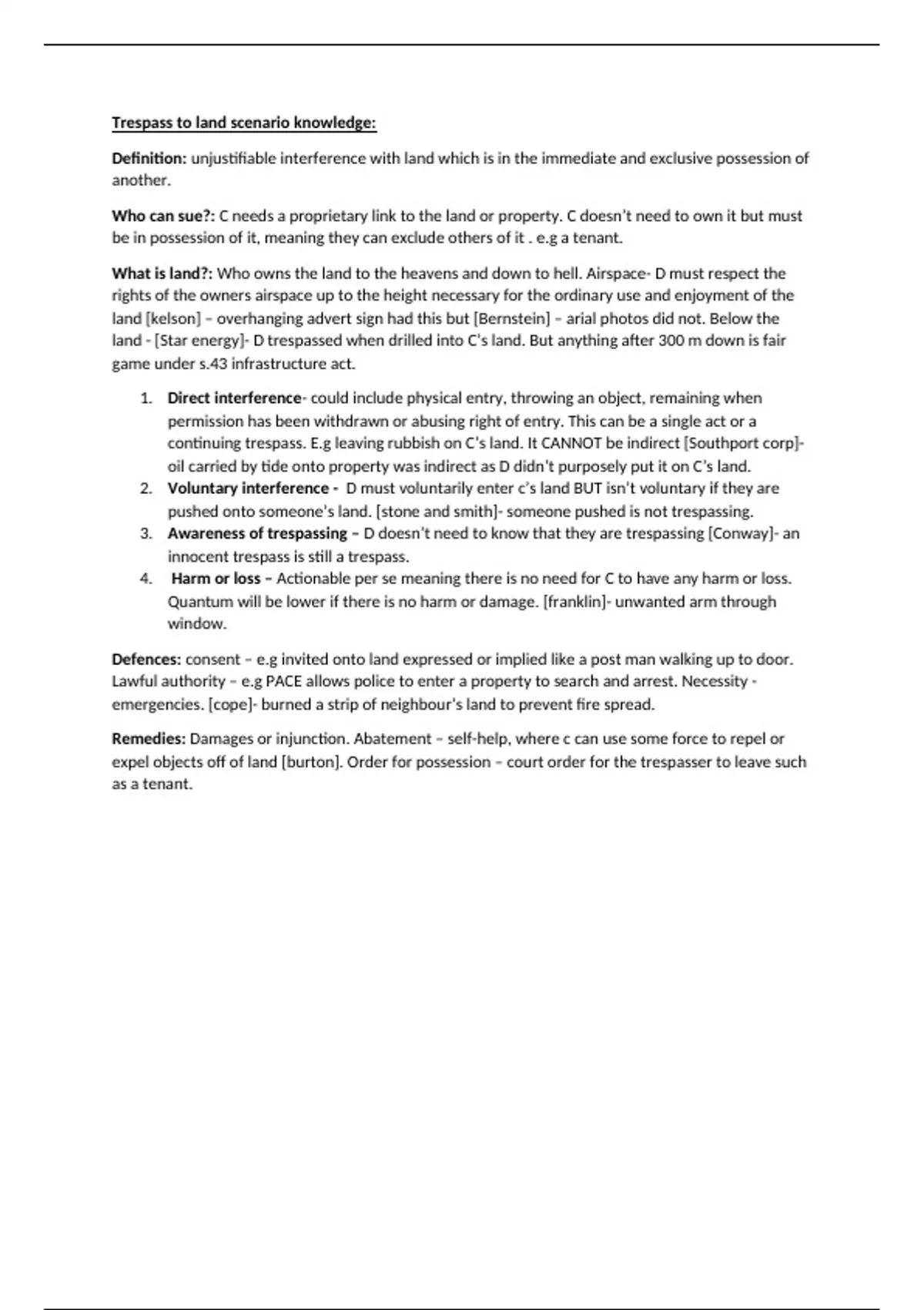 In depth knowledge and plan needed for a scenario essay on trespass to land (tort)