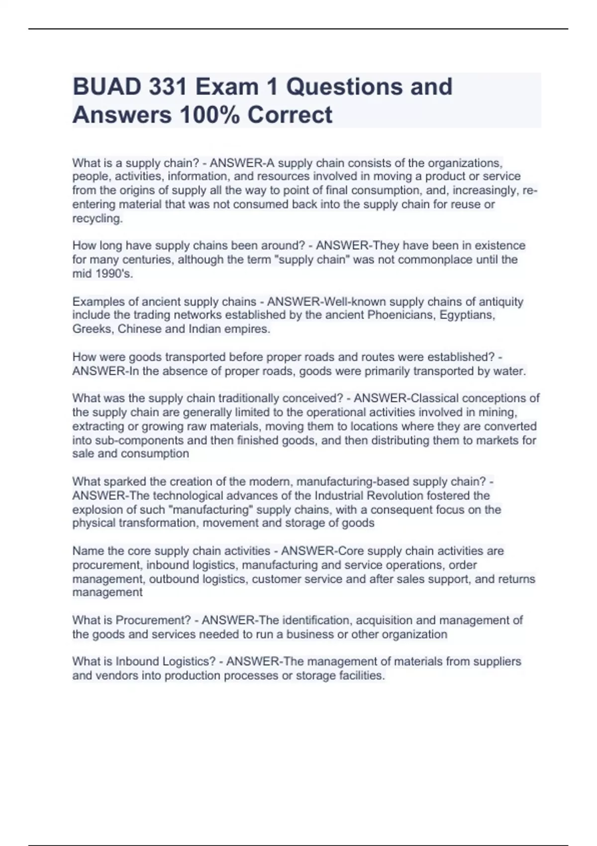 BUAD 331 Exam 1 Questions and Answers 100% CorrectBUAD 331 Exam 1 Questions and Answers 100% CorrectBUAD 331 Exam 1 Questions and Answers 100% CorrectBUAD 331 Exam 1 Questions and Answers 100% CorrectBUAD 331 Exam 1 Questions and Answers 100% Correct What is a supply chain? - ANSWER-A supply chain consists of the organizations, people, activities, information, and resources involved in moving a product or service from the origins of supply all the way to point of final consumption, and, increasingly, re-entering material that was not consumed back into the supply chain for reuse or recycling. How long have supply chains been around? - ANSWER-They have been in existence for many centuries, although the term "supply chain" was not commonplace until the mid 1990's. Examples of ancient supply chains - ANSWER-Well-known supply chains of antiquity include the trading networks established by the ancient Phoenicians, Egyptians, Greeks, Chinese and Indian empires. How were goods transported before proper roads and routes were established? - ANSWER-In the absence of proper roads, goods were primarily transported by water. What was the supply chain traditionally conceived? - ANSWER-Classical conceptions of the supply chain are generally limited to the operational activities involved in mining, extracting or growing raw materials, moving them to locations where they are converted into sub-components and then finished goods, and then distributing them to markets for sale and consumption What sparked the creation of the modern, manufacturing-based supply chain? - ANSWER-The technological advances of the Industrial Revolution fostered the explosion of such "manufacturing" supply chains, with a consequent focus on the physical transformation, movement and storage of goods Name the core supply chain activities - ANSWER-Core supply chain activities are procurement, inbound logistics, manufacturing and service operations, order management, outbound logistics, customer service and after sales support, and returns management What is Procurement? - ANSWER-The identification, acquisition and management of the goods and services needed to run a business or other organization