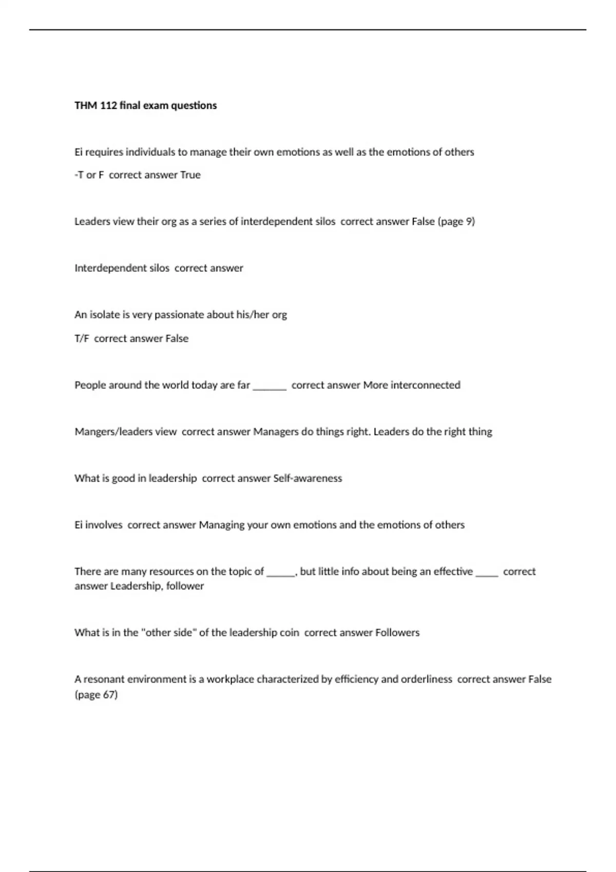 THM 112 final exam questions and correct answers