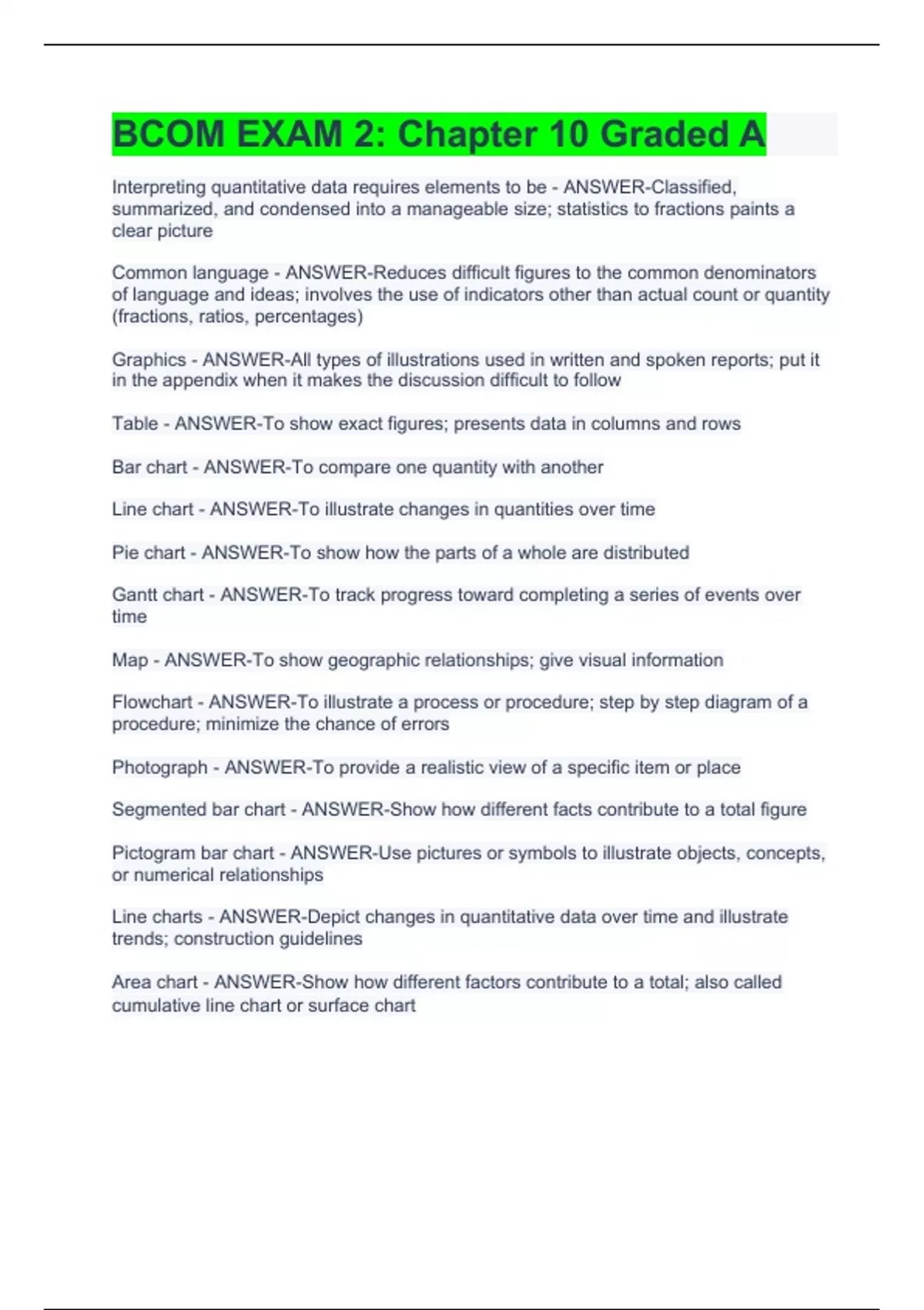 Interpreting quantitative data requires elements to be - ANSWER-Classified, summarized, and condensed into a manageable size; statistics to fractions paints a clear picture Common language - ANSWER-Reduces difficult figures to the common denominators of language and ideas; involves the use of indicators other than actual count or quantity (fractions, ratios, percentages) Graphics - ANSWER-All types of illustrations used in written and spoken reports; put it in the appendix when it makes the discussion difficult to follow Table - ANSWER-To show exact figures; presents data in columns and rows Bar chart - ANSWER-To compare one quantity with another Line chart - ANSWER-To illustrate changes in quantities over time Pie chart - ANSWER-To show how the parts of a whole are distributed Gantt chart - ANSWER-To track progress toward completing a series of events over time Map - ANSWER-To show geographic relationships; give visual information Flowchart - ANSWER-To illustrate a process or procedure; step by step diagram of a procedure; minimize the chance of errors