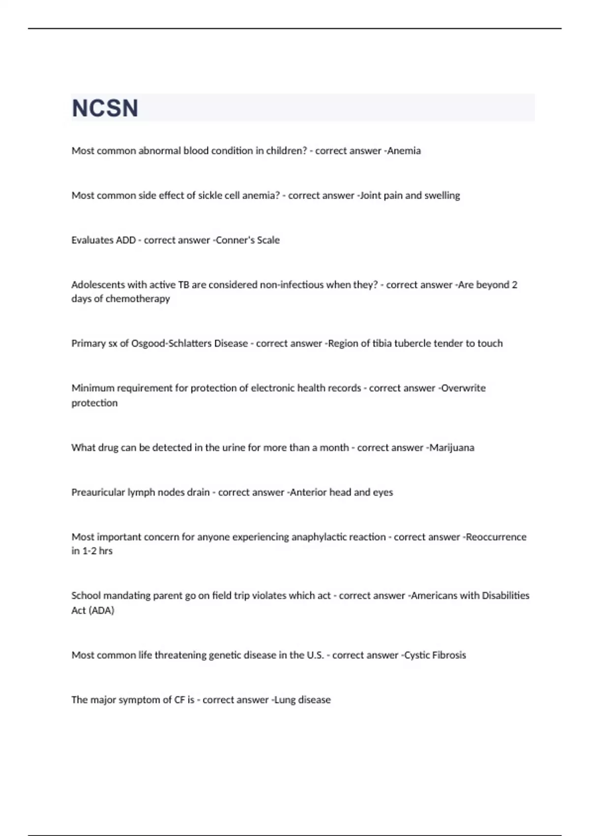 Most common abnormal blood condition in children? Anemia Most common side effect of sickle cell anemia? Joint pain and swelling Evaluates ADD Conner's Scale Adolescents with active TB are considered non-infectious when they? Are beyond 2 days of chemotherapy Primary sx of Osgood-Schlatters Disease Region of tibia tubercle tender to touch Minimum requirement for protection of electronic health records Overwrite protection What drug can be detected in the urine for more than a month Marijuana Preauricular lymph nodes drain Anterior head and eyes Most important concern for anyone experiencing anaphylactic reaction Reoccurrence in 1-2 hrs School mandating parent go on field trip violates which act Americans with Disabilities Act (ADA) Most common life threatening genetic disease in the U.S. Cystic Fibrosis The major symptom of CF is Lung disease Failure to thrive, recurrent resp infections, and meconiume ileus at birth are indicative of what disorder? Cystic Fibrosis