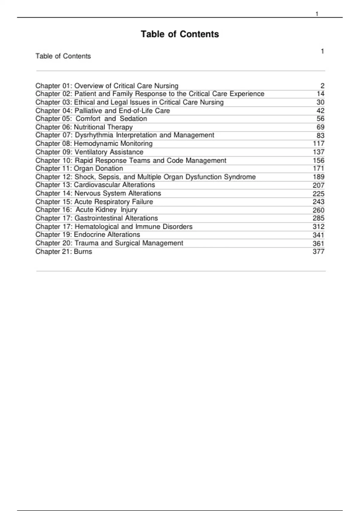 1. Which of the following professional organizations best supports critical care nursing practice? a. American Association of Critical-Care Nurses b. American Heart Association c. American Nurses Association d. Society of Critical Care Medicine ANS: A The American Association of Critical-Care Nurses is the specialty organization that supports and represents critical care nurses. The American Heart Association supports cardiovascular initiatives. The American Nurses Association supports all nurses. The Society of Critical Care Medicine represents the multiprofessional critical care team under the direction of an intensivist. DIF: Cognitive Level: Knowledge REF: p. 4 OBJ: Discuss the purposes and functions of the professional organizations that support critical care practice. TOP: Nursing Process Step: N/A MSC: NCLEX: Safe and Effective Care Environment 2. A nurse has been working as a staff nurse in the surgical intensive care unit for 2 years and is interested in certification. Which credential would be most applicable for her to seek? a. ACNPC b. CCNS c. CCRN d. PCCN ANS: C The CCRN certification is appropriate for nurses in bedside practice who care for critically ill patients. The ACNPC certification is for acute care nurse practitioners. The CCNS certification is for critical care clinical nurse specialists. The PCCN certification is for staff nurses working in progressive care, intermediate care, or step-down unit settings. DIF: Cognitive Level: Application REF: p. 5 OBJ: Explain certification options for critical care nurses. TOP: Nursing Process Step: N/A MSC: NCLEX: Safe and Effective Care Environment 3. The main purpose of certification is to: a. assure the consumer that you will not make a mistake. b. prepare for graduate school. c. promote magnet status for your facility. d. validate knowledge of critical care nursing. ANS: D Certification assists in validating knowledge of the field, promotes excellence in the profession, and helps nurses to maintain their knowledge of critical care nursing. Certification helps to assure the consumer that the nurse has a minimum level of knowledge; however, it does not ensure that care will be mistake-free. Certification does not prepare one for graduate school; however, achieving certification demonstrates motivation for achievement and professionalism. Magnet facilities are rated on the number of certified nurses; however, that is not the purpose of certification. DIF: Cognitive Level: Analysis REF: pp. 4-5 OBJ: Explain certification options for critical care nurses. TOP: Nursing Process Step: N/A MSC: NCLEX: Safe and Effective Care Environment 4. The synergy model of practice focuses on: a. allowing unrestricted visiting for the patient 24 hours each day. b. holistic and alternative therapies. c. needs of patients and their families, which drives nursing competency. d. patients needs for energy and support. ANS: C The synergy model of practice states that the needs of patients and families influence and drive competencies of nurses. Nursing practice based on the synergy model would involve tailored visiting to meet the patients and familys needs and application of alternative therapies if desired by the patient, but that is not the primary focus of the model. DIF: Cognitive Level: Application REF: p. 5 | Fig. 1-3 OBJ: Describe standards of professional practice for critical care nursing. TOP: Nursing Process Step: N/A MSC: NCLEX: Safe and Effective Care Environment 5. The family of your critically ill patient tells you that they have not spoken with the physician in over 24 hours and they have some questions that they want clarified. During morning rounds, you convey this concern to the attending intensivist and arrange for her to meet with the family at 4:00 PM in the conference room. Which competency of critical care nursing does this represent? a. Advocacy and moral agency in solving ethical issues b. Clinical judgment and clinical reasoning skills c. Collaboration with patients, families, and team members d. Facilitation of learning for patients, families, and team members ANS: C Although one might consider that all of these competencies are being addressed, communication and collaboration with the family and physician best exemplify the competency of collaboration. DIF: Cognitive Level: Analysis REF: p. 9 OBJ: Describe standards of professional practice for critical care nursing. TOP: Nursing Process Step: N/A MSC: NCLEX: Safe and Effective Care Environment 6. The AACN Standards for Acute and Critical Care Nursing Practice use what framework to guide critical care nursing practice? a. Evidence-based practice b. Healthy work environment c. National Patient Safety Goals d. Nursing process ANS: D The AACN Standards for Acute and Critical Care Nursing Practice delineate the nursing process as applied to critically ill patients: collect data, determine diagnoses, identify expected outcomes, develop a plan of care, implement interventions, and evaluate care. AACN promotes a healthy work environment, but this is not included in the Standards. The Joint Commission has established National Patient Safety Goals, but these are not the AACN Standards. DIF: Cognitive Level: Analysis REF: p. 5 | Box 1-2 OBJ: Describe standards of professional practice for critical care nursing. TOP: Nursing Process Step: N/A MSC: NCLEX: Safe and Effective Care Environment 7. The charge nurse is responsible for making the patient assignments on the critical care unit. She assigns the experienced, certified nurse to care for the acutely ill patient with sepsis who also requires continuous renal replacement therapy and mechanical ventilation. She assigns the nurse with less than 1 year of experience to two patients who are more stable. This assignment reflects implementation of the: a. crew resource management model b. National Patient Safety Goals c. Quality and Safety Education for Nurses (QSEN) model d. synergy model of practice ANS: D This assignment demonstrates 