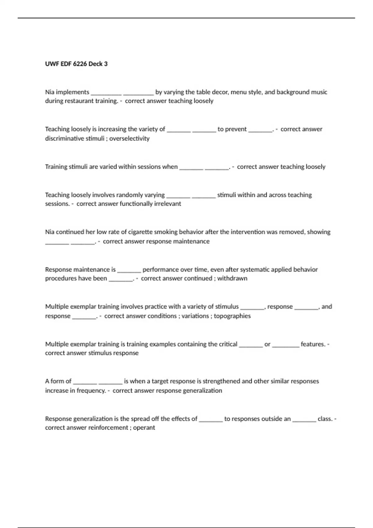 Nia implements _________ _________ by varying the table decor, menu style, and background music during restaurant training. - correct answer teaching loosely Teaching loosely is increasing the variety of _______ _______ to prevent _______. - correct answer discriminative stimuli ; overselectivity Training stimuli are varied within sessions when _______ _______. - correct answer teaching loosely Teaching loosely involves randomly varying _______ _______ stimuli within and across teaching sessions. - correct answer functionally irrelevant Nia continued her low rate of cigarette smoking behavior after the intervention was removed, showing _______ _______. - correct answer response maintenance Response maintenance is _______ performance over time, even after systematic applied behavior procedures have been _______. - correct answer continued ; withdrawn Multiple exemplar training involves practice with a variety of stimulus _______, response _______, and response _______. - correct answer conditions ; variations ; topographies Multiple exemplar training is training examples containing the critical _______ or ________ features. - correct answer stimulus response A form of _______ _______ is when a target response is strengthened and other similar responses increase in frequency. - correct answer response generalization Response generalization is the spread off the effects of _______ to responses outside an _______ class. - correct answer reinforcement ; operant