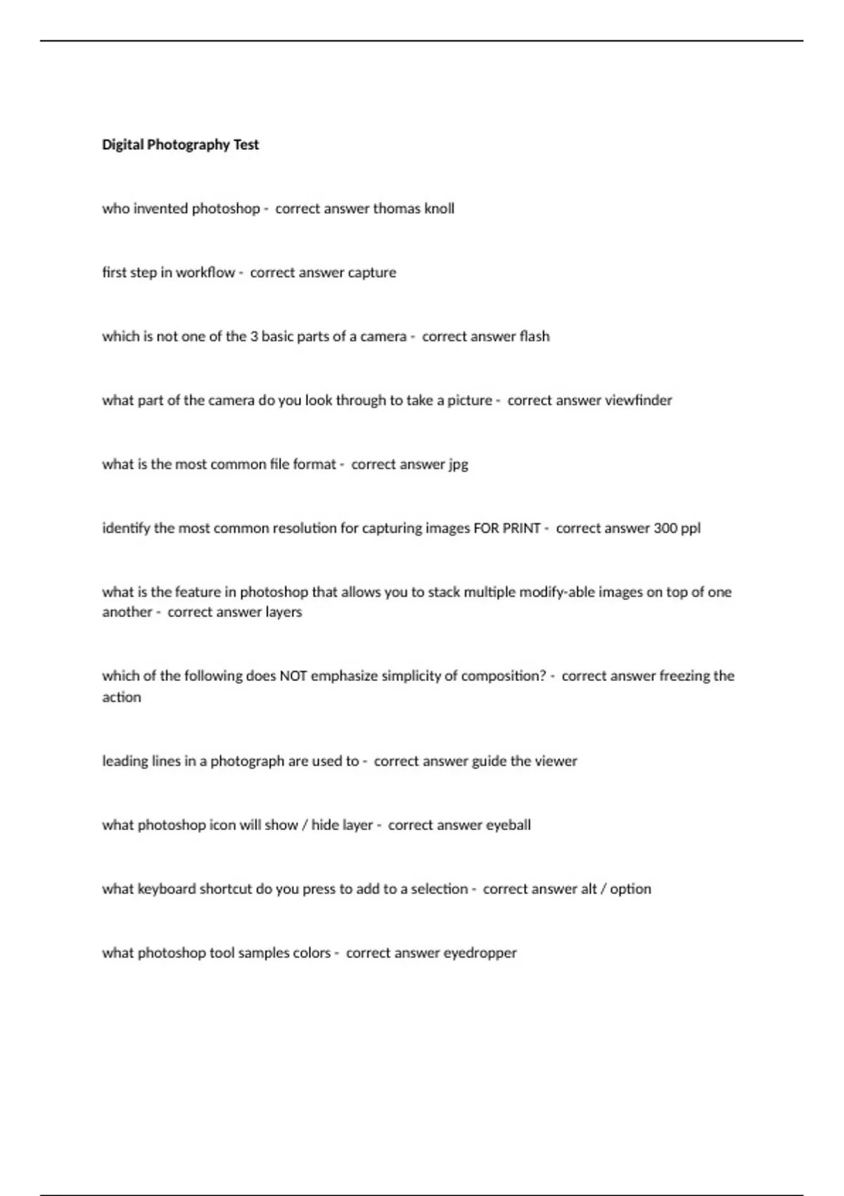 who invented photoshop - correct answer thomas knoll first step in workflow - correct answer capture which is not one of the 3 basic parts of a camera - correct answer flash what part of the camera do you look through to take a picture - correct answer viewfinder what is the most common file format - correct answer jpg identify the most common resolution for capturing images FOR PRINT - correct answer 300 ppl what is the feature in photoshop that allows you to stack multiple modify-able images on top of one another - correct answer layers which of the following does NOT emphasize simplicity of composition? - correct answer freezing the action leading lines in a photograph are used to - correct answer guide the viewer what photoshop icon will show / hide layer - correct answer eyeball what keyboard shortcut do you press to add to a selection - correct answer alt / option what photoshop tool samples colors - correct answer eyedropper