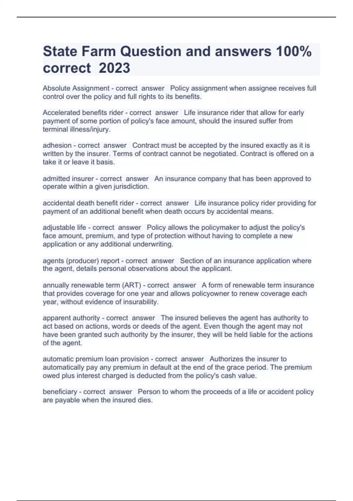 State Farm Question and answers 100% correct 2023 Absolute Assignment - correct answer Policy assignment when assignee receives full control over the policy and full rights to its benefits. Accelerated benefits rider - correct answer Life insurance rider that allow for early payment of some portion of policy's face amount, should the insured suffer from terminal illness/injury. adhesion - correct answer Contract must be accepted by the insured exactly as it is written by the insurer. Terms of contract cannot be negotiated. Contract is offered on a take it or leave it basis. admitted insurer - correct answer An insurance company that has been approved to operate within a given jurisdiction. accidental death benefit rider - correct answer Life insurance policy rider providing for payment of an additional benefit when death occurs by accidental means. adjustable life - correct answer Policy allows the policymaker to adjust the policy's face amount, premium, and type of protection without having to complete a new application or any additional underwriting. agents (producer) report - correct answer Section of an insurance application where the agent, details personal observations about the applicant. annually renewable term (ART) - correct answer A form of renewable term insurance that provides coverage for one year and allows policyowner to renew coverage each year, without evidence of insurability.