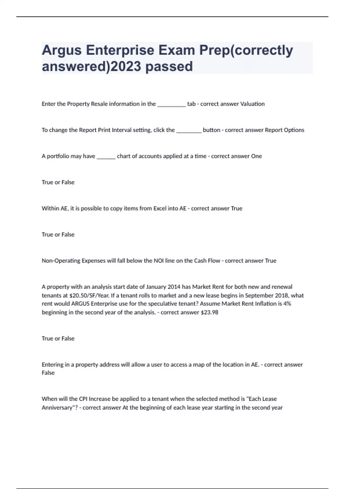 Argus Enterprise Exam Prep(correctly answered)2023 passed Enter the Property Resale information in the _________ tab - correct answer Valuation To change the Report Print Interval setting, click the ________ button - correct answer Report Options A portfolio may have ______ chart of accounts applied at a time - correct answer One True or False Within AE, it is possible to copy items from Excel into AE - correct answer True True or False Non-Operating Expenses will fall below the NOI line on the Cash Flow - correct answer True A property with an analysis start date of January 2014 has Market Rent for both new and renewal tenants at $20.50/SF/Year. If a tenant rolls to market and a new lease begins in September 2018, what rent would ARGUS Enterprise use for the speculative tenant? Assume Market Rent Inflation is 4% beginning in the second year of the analysis. - correct answer $23.98 True or False Entering in a property address will allow a user to access a map of the location in AE. - correct answer False When will the CPI Increase be applied to a tenant when the selected method is "Each Lease Anniversary"? - correct answer At the beginning of each lease year starting in the second year