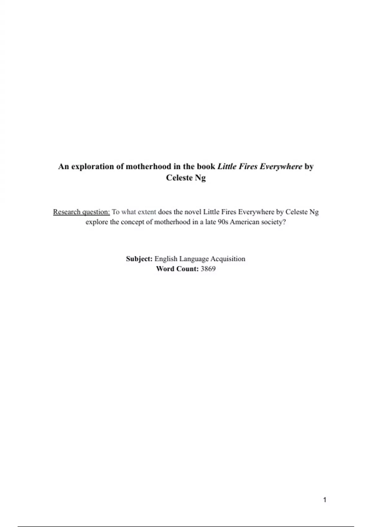 Extended Essay: (Graded A) An exploration of motherhood in the book Little Fires Everywhere by Celeste Ng