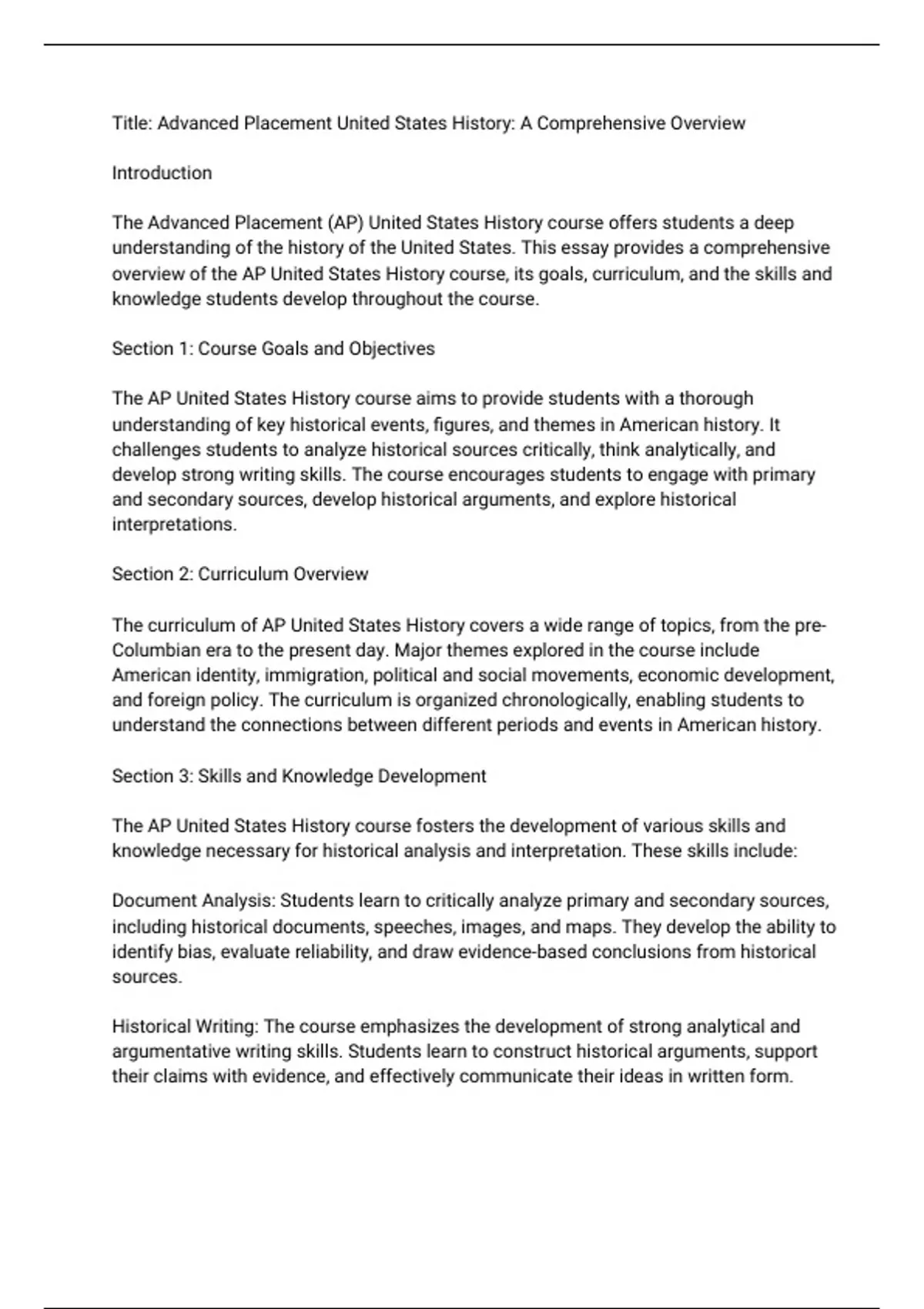 The provided text was an outline for an essay on Advanced Placement United States History. It covered the goals and objectives of the course, the curriculum, skills and knowledge development, exam structure and preparation, and the importance of studying U.S. history. The essay aimed to provide a comprehensive understanding of the course and its significance in developing critical thinking, historical analysis, and writing skills in students.