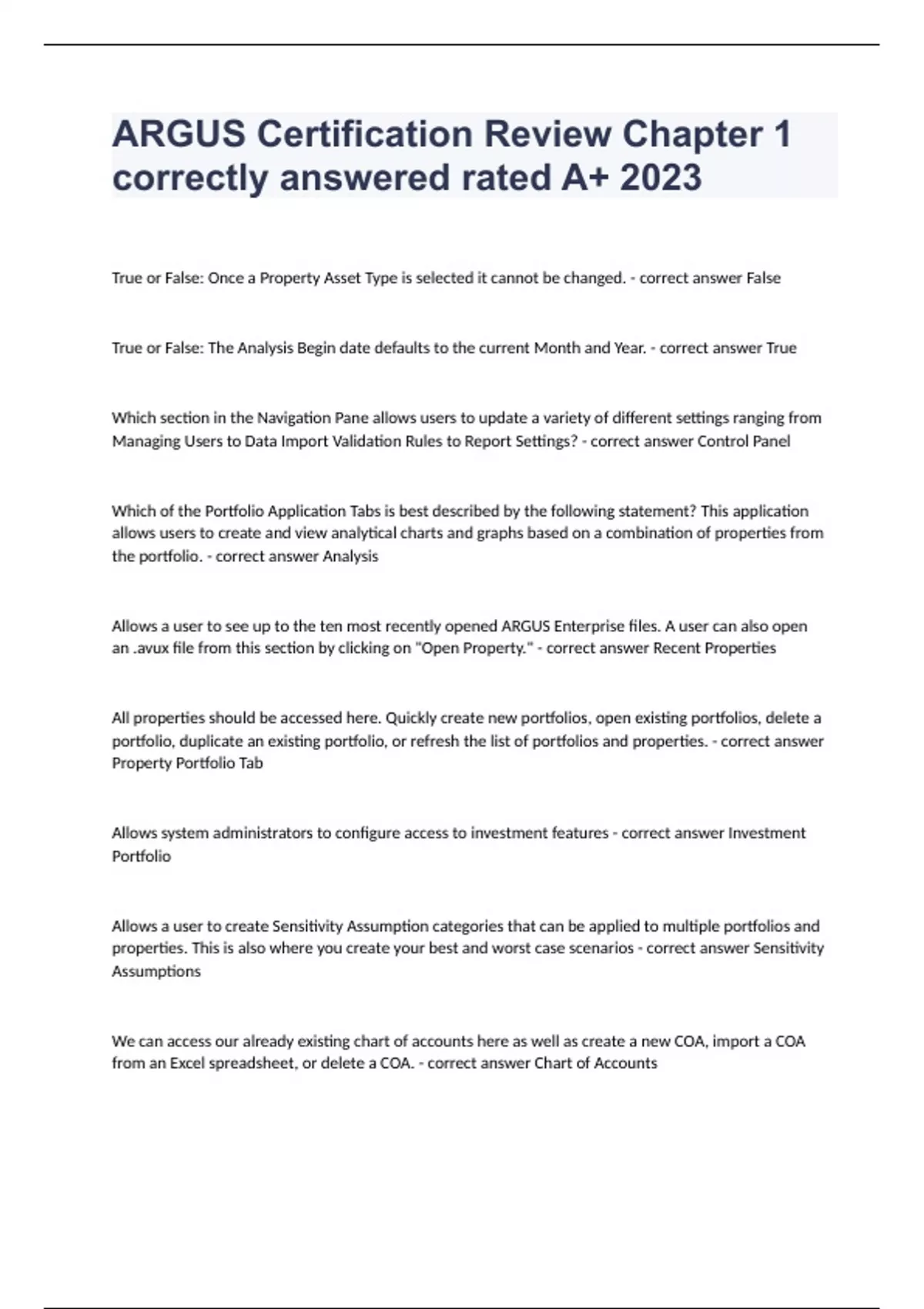ARGUS Certification Review Chapter 1 correctly answered rated A+ 2023 True or False: Once a Property Asset Type is selected it cannot be changed. - correct answer False True or False: The Analysis Begin date defaults to the current Month and Year. - correct answer True Which section in the Navigation Pane allows users to update a variety of different settings ranging from Managing Users to Data Import Validation Rules to Report Settings? - correct answer Control Panel Which of the Portfolio Application Tabs is best described by the following statement? This application allows users to create and view analytical charts and graphs based on a combination of properties from the portfolio. - correct answer Analysis Allows a user to see up to the ten most recently opened ARGUS Enterprise files. A user can also open an .avux file from this section by clicking on "Open Property." - correct answer Recent Properties All properties should be accessed here. Quickly create new portfolios, open existing portfolios, delete a portfolio, duplicate an existing portfolio, or refresh the list of portfolios and properties. - correct answer Property Portfolio Tab Allows system administrators to configure access to investment features - correct answer Investment Portfolio Allows a user to create Sensitivity Assumption categories that can be applied to multiple portfolios and properties. This is also where you create your best and worst case scenarios - correct answer Sensitivity Assumptions We can access our already existing chart of accounts here as well as create a new COA, import a COA from an Excel spreadsheet, or delete a COA. - correct answer Chart of Accounts
