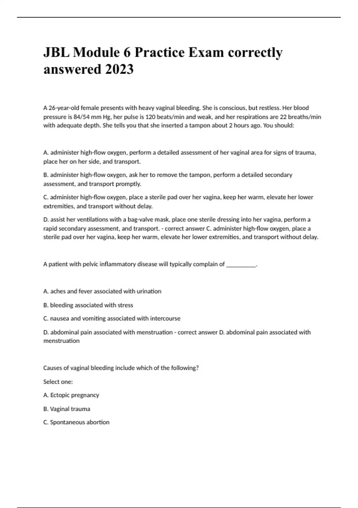 JBL Module 6 Practice Exam correctly answered 2023A 26-year-old female presents with heavy vaginal bleeding. She is conscious, but restless. Her blood pressure is 84/54 mm Hg, her pulse is 120 beats/min and weak, and her respirations are 22 breaths/min with adequate depth. She tells you that she inserted a tampon about 2 hours ago. You should: A. administer high-flow oxygen, perform a detailed assessment of her vaginal area for signs of trauma, place her on her side, and transport. B. administer high-flow oxygen, ask her to remove the tampon, perform a detailed secondary assessment, and transport promptly. C. administer high-flow oxygen, place a sterile pad over her vagina, keep her warm, elevate her lower extremities, and transport without delay. D. assist her ventilations with a bag-valve mask, place one sterile dressing into her vagina, perform a rapid secondary assessment, and transport. - correct answer C. administer high-flow oxygen, place a sterile pad over her vagina, keep her warm, elevate her lower extremities, and transport without delay. A patient with pelvic inflammatory disease will typically complain of _________. A. aches and fever associated with urination B. bleeding associated with stress C. nausea and vomiting associated with intercourse D. abdominal pain associated with menstruation - correct answer D. abdominal pain associated with menstruation Causes of vaginal bleeding include which of the following? Select one: A. Ectopic pregnancy B. Vaginal trauma C. Spontaneous abortion