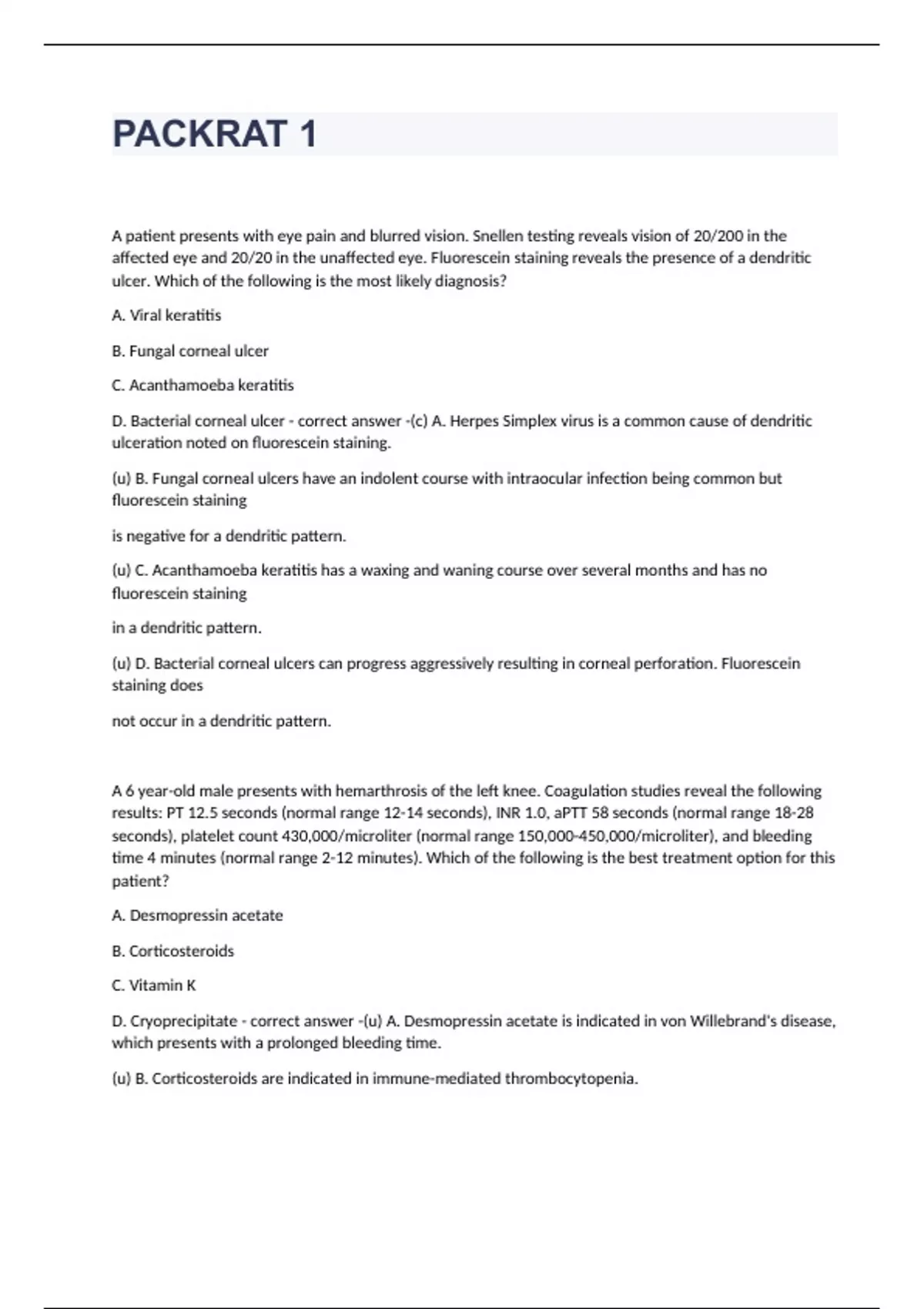 A patient presents with eye pain and blurred vision. Snellen testing reveals vision of 20/200 in the affected eye and 20/20 in the unaffected eye. Fluorescein staining reveals the presence of a dendritic ulcer. Which of the following is the most likely diagnosis? A. Viral keratitis B. Fungal corneal ulcer C. Acanthamoeba keratitis D. Bacterial corneal ulcer (c) A. Herpes Simplex virus is a common cause of dendritic ulceration noted on fluorescein staining. (u) B. Fungal corneal ulcers have an indolent course with intraocular infection being common but fluorescein staining is negative for a dendritic pattern. (u) C. Acanthamoeba keratitis has a waxing and waning course over several months and has no fluorescein staining in a dendritic pattern. (u) D. Bacterial corneal ulcers can progress aggressively resulting in corneal perforation. Fluorescein staining does not occur in a dendritic pattern. A 6 year-old male presents with hemarthrosis of the left knee. Coagulation studies reveal the following results: PT 12.5 seconds (normal range 12-14 seconds), INR 1.0, aPTT 58 seconds (normal range 18-28 seconds), platelet count 430,000/microliter (normal range 150,000-450,000/microliter), and bleeding time 4 minutes (normal range 2-12 minutes). Which of the following is the best treatment option for this patient? A. Desmopressin acetate B. Corticosteroids C. Vitamin K D. Cryoprecipitate (u) A. Desmopressin acetate is indicated in von Willebrand's disease, which presents with a prolonged bleeding time. (u) B. Corticosteroids are indicated in immune-mediated thrombocytopenia. (u) C. Vitamin K deficiency will prolong the PT greater than the aPTT. Vitamin K supplement is not indicated in this patient. (c) D.Hemophilia A presents with a prolonged aPTT and normal platelet count and function. Hemophilia A is treated with factor VIII concentrate or cryoprecipitate. An HIV positive patient presents with worsening dementia, fever, headache, and right hemiparesis. MRI of the brain reveals six lesions throughout the brain that show ring enhancement and surrounding edema. Which of the following is the treatment of choice? A. Sulfadiazine and pyrimethamine B. Trimethoprim-sulfamethoxazole C. Radiation therapy D. Ventricular shunt placement (c) A. Toxoplasmosis is commonly noted in HIV positive patients and presents with multiple ring-enhancing lesions. Treatment of choice for possible toxoplasmosis is sulfadiazine and pyrimethamine. (u) B. Trimethoprim-sulfamethoxazole is used for prophylaxis of toxoplasmosis, but not for treatment of acute infection. (u) C. Radiation therapy is indicated in CNS lymphoma, which typically presents with a single lesion. (u) D. Shunt placement is not indicated in patients with toxoplasmosis.