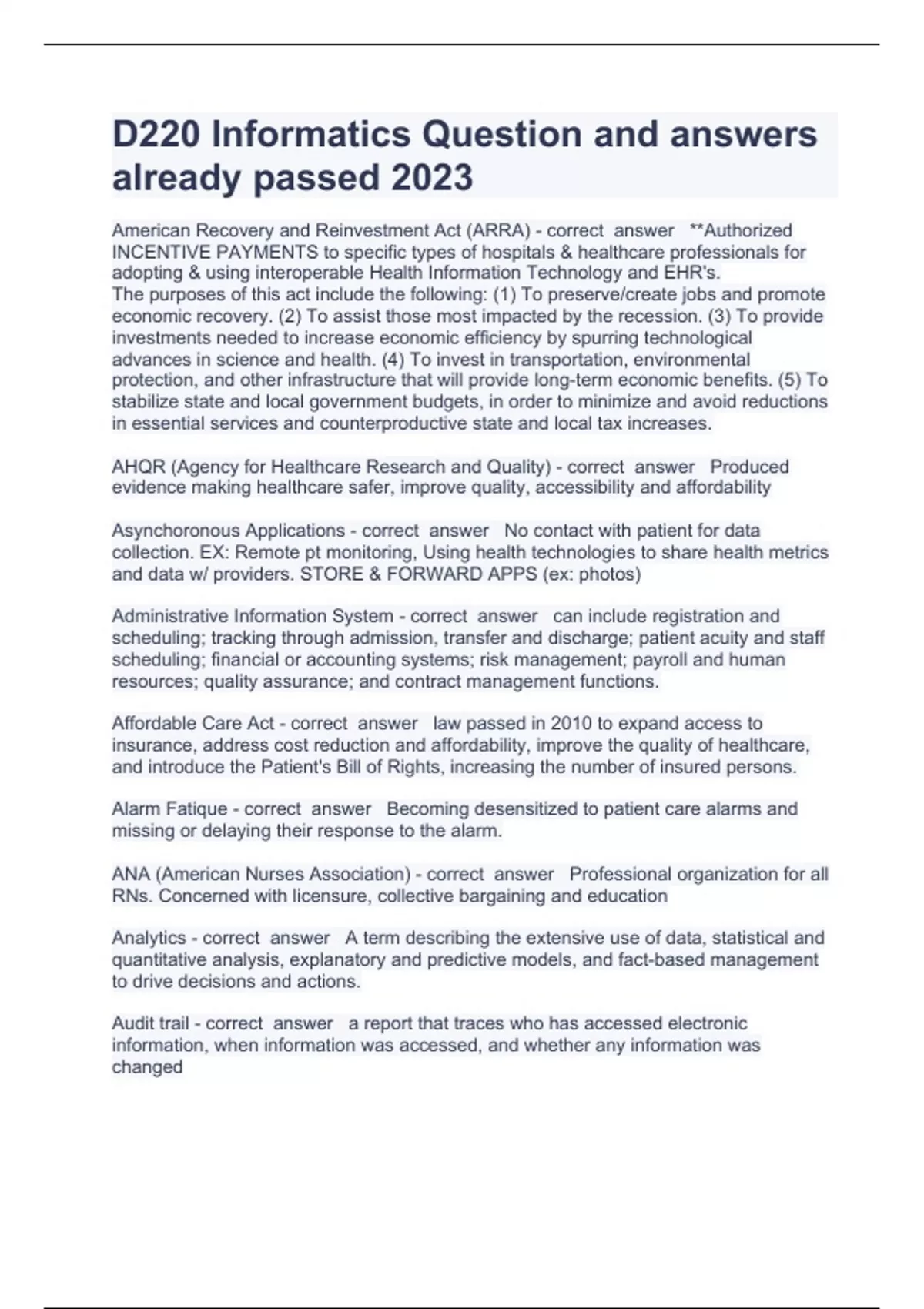 D220 Informatics Question and answers already passed 2023 American Recovery and Reinvestment Act (ARRA) - correct answer **Authorized INCENTIVE PAYMENTS to specific types of hospitals & healthcare professionals for adopting & using interoperable Health Information Technology and EHR's. The purposes of this act include the following: (1) To preserve/create jobs and promote economic recovery. (2) To assist those most impacted by the recession. (3) To provide investments needed to increase economic efficiency by spurring technological advances in science and health. (4) To invest in transportation, environmental protection, and other infrastructure that will provide long-term economic benefits. (5) To stabilize state and local government budgets, in order to minimize and avoid reductions in essential services and counterproductive state and local tax increases. AHQR (Agency for Healthcare Research and Quality) - correct answer Produced evidence making healthcare safer, improve quality, accessibility and affordability Asynchoronous Applications - correct answer No contact with patient for data collection. EX: Remote pt monitoring, Using health technologies to share health metrics and data w/ providers. STORE & FORWARD APPS (ex: photos) Administrative Information System - correct answer can include registration and scheduling; tracking through admission, transfer and discharge; patient acuity and staff scheduling; financial or accounting systems; risk management; payroll and human resources; quality assurance; and contract management functions. Affordable Care Act - correct answer law passed in 2010 to expand access to insurance, address cost reduction and affordability, improve the quality of healthcare, and introduce the Patient's Bill of Rights, increasing the number of insured persons. Alarm Fatique - correct answer Becoming desensitized to patient care alarms and missing or delaying their response to the alarm. ANA (American Nurses Association) - correct answer Professional organization for all RNs. Concerned with licensure, collective bargaining and education Analytics - correct answer A term describing the extensive use of data, statistical and quantitative analysis, explanatory and predictive models, and fact-based management to drive decisions and actions. Audit trail - correct answer a report that traces who has accessed electronic information, when information was accessed, and whether any information was changed