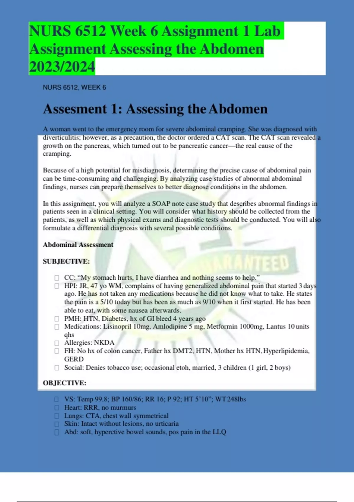 NURS 6512 Week 6 Assignment 1 Lab Assignment Assessing the Abdomen 2023/202
