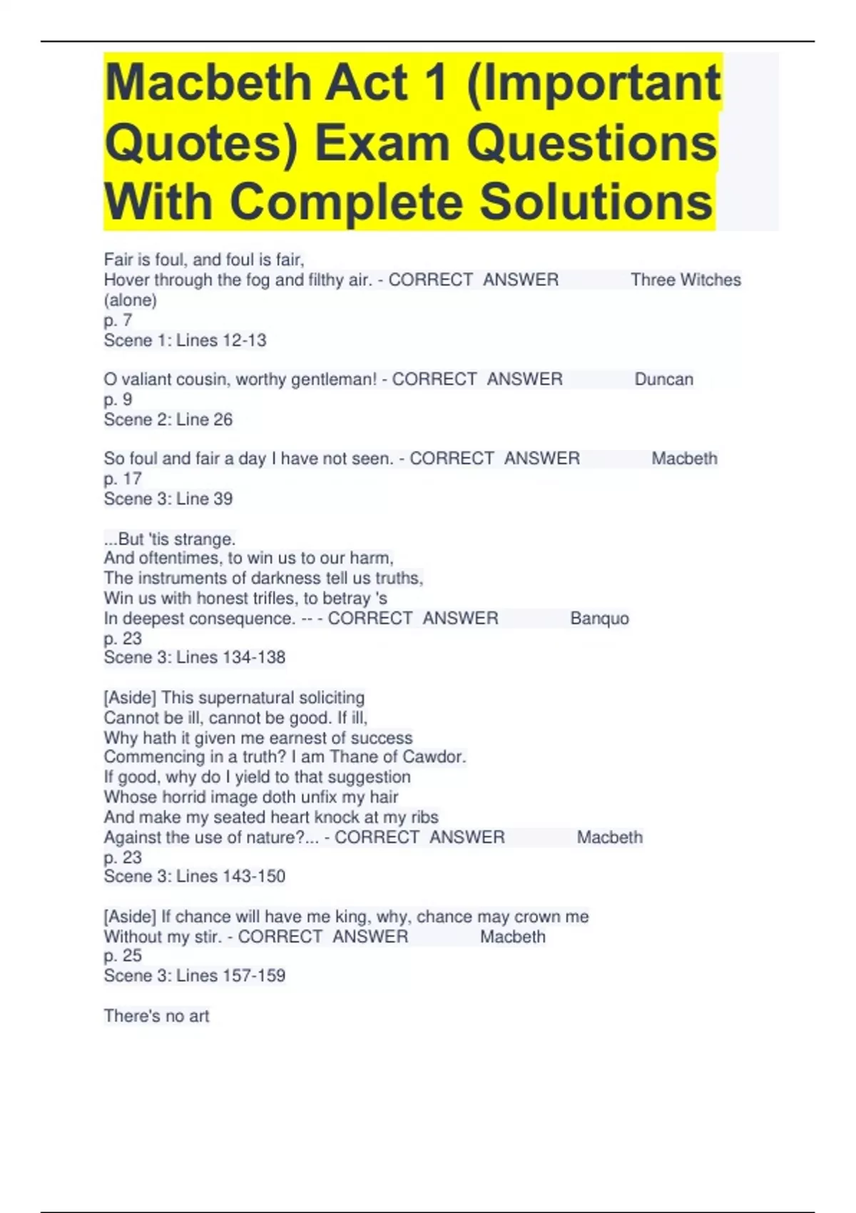 Macbeth Act 1 (Important Quotes) Exam Questions With Complete Solutions Fair is foul, and foul is fair, Hover through the fog and filthy air. - CORRECT ANSWER Three Witches (alone) p. 7 Scene 1: Lines 12-13 O valiant cousin, worthy gentleman! - CORRECT ANSWER Duncan p. 9 Scene 2: Line 26 So foul and fair a day I have not seen. - CORRECT ANSWER Macbeth p. 17 Scene 3: Line 39 ...But 'tis strange. And oftentimes, to win us to our harm, The instruments of darkness tell us truths, Win us with honest trifles, to betray 's In deepest consequence. -- - CORRECT ANSWER Banquo p. 23 Scene 3: Lines 134-138 [Aside] This supernatural soliciting Cannot be ill, cannot be good. If ill, Why hath it given me earnest of success Commencing in a truth? I am Thane of Cawdor. If good, why do I yield to that suggestion Whose horrid image doth unfix my hair And make my seated heart knock at my ribs Against the use of nature?... - CORRECT ANSWER Macbeth p. 23 Scene 3: Lines 143-150 [Aside] If chance will have me king, why, chance may crown me Without my stir. - CORRECT ANSWER Macbeth p. 25 Scene 3: Lines 157-159 There's no art To find the mind's construction in the face. He was a gentleman on whom I built An absolute trust. - CORRECT ANSWER Duncan p. 27 Scene 4: Lines 13-16 [Aside] The Prince of Cumberland! That is a step On which I must fall down or else o'erleap, For in my way it lies. Stars, hide your fires; Let not light see my black and deep desires. - CORRECT ANSWER Macbeth p. 29 Scene 4: Lines 55-58