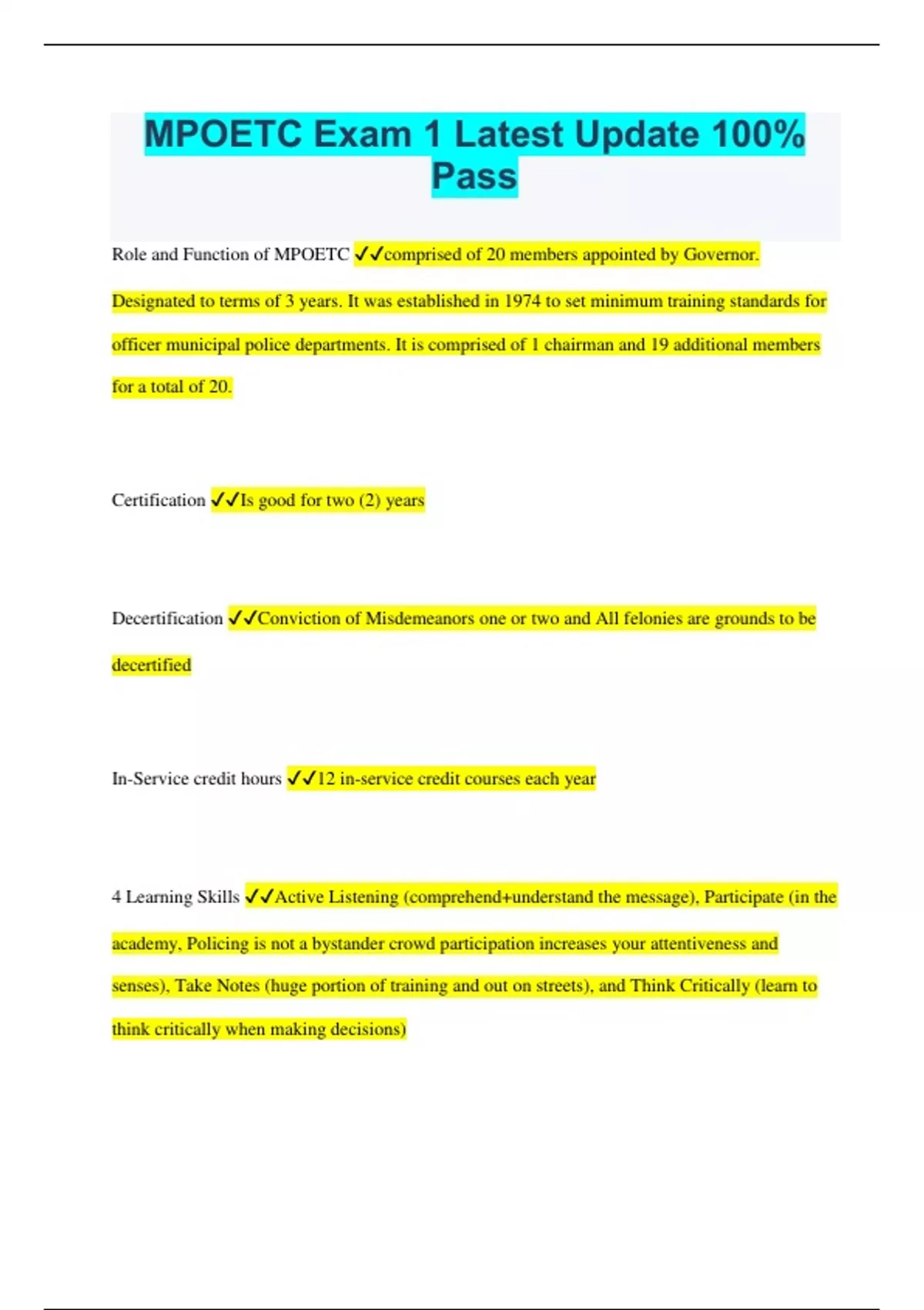 MPOETC Exam 1 Latest Update 100% Pass Role and Function of MPOETC comprised of 20 members appointed by Governor. Designated to terms of 3 years. It was established in 1974 to set minimum training standards for officer municipal police departments. It is comprised of 1 chairman and 19 additional members for a total of 20. Certification Is good for two (2) years Decertification Conviction of Misdemeanors one or two and All felonies are grounds to be decertified In-Service credit hours 12 in-service credit courses each year 4 Learning Skills Active Listening (comprehend+understand the message), Participate (in the academy, Policing is not a bystander crowd participation increases your attentiveness and senses), Take Notes (huge portion of training and out on streets), and Think Critically (learn to think critically when making decisions) Think Critically The critical thinker can explain+defend a reasonable position, draw conclusions when warranted but with caution, and acknowledge what they don't know & seek answers. Speaking requires more thought than listening. active listening paying close attention to what someone is saying and communicating Retention Most people forget 80% of what is said within two weeks Sir Robert Peel's 1st Principle The basic mission for which the police exist is to prevent crime and disorder. Sir Robert Peel's 2nd Principle The ability of the police to perform their duties is dependent on public approval of police actions. Sir Robert Peel's 3rd Principle Police Must secure the willing cooperation of the public in voluntary observance of the law to be able to secure and maintain the respect of the public. Sir Robert Peel's 4th Principle The degree of cooperation of the public that can be secured diminishes proportionately with the necessity of the use of physical force. Sir Robert Peel's 5th Principle Police seek and preserve public favor not by catering to the public opinion, but by constantly demonstrating absolute impartial service to the law Sir Robert Peel's 6th Principle Police use physical force to the extent necessary to secure observance of the law or to restore order only when the exercise of persuasion, advice and warning is found to be insufficient Sir Robert Peel's 7th Principle Police, at all times, should maintain a relationship with the public that gives reality to the historic tradition that the police are the public and the public are the police, the police being only members of the public who are paid to give full-time attention to duties which are incumbent on every citizen in the interests of community welfare and existence Sir Robert Peel's 8th Principle Police should always direct their action strictly towards their functions and never appear to usurp the powers of the judiciary Sir Robert Peel's 9th Principle The test of police efficiency is the absence of crime and disorder, not the visible evidence of police action in dealing with it Probable Cause sufficient reason based upon known facts to believe a crime has been committed Sir Robert Peel -He introduced a number of important reforms of British criminal law and is considered the father of modern policing. He enabled the "Metropolitan Police Act of 1829" Three Era's of Policing Political, Reform, Community (currently in this era) Political Era Politicians to constituents, Nepotism was a way of gaining police jobs. Police provided a wide variety of social services. Often it was a large, burley, young man Reform Era Police Reformers narrowed the police function to crime control. D.A.R.E. Maintained the status quo. Reactive, incident driven Police service. Proactive programs started being created. Community Era *we are currently in this era* Work with community to develop a sense of lawfulness in our society. We want their input, we want them to invest in their community police agency. Started from social scientist's studies in the 1970's and 1980's Community Definition all the people living in a defined geographical area with distinct ties, social, interactions, and shared values*** Quality of Life Issues Environmental circumstances that create a negative effect on the quality of one's neighborhood. Ex: Abandoned houses, abandoned cars, Prostitutes, and Panhandlers Community Policing is both a philosophy and a method by which new programs are adopted that allow for the cooperation between police and the public. Community Policing is not only focused on addressing criminal problems, but also the "quality of life issues". ***Reduce Crime + Ensure Citizen Safety and community policing is not immune to budgetary constraints*** Steps in Order 1st Preliminary Arraignment (Bail set here), 2nd Preliminary Hearing (Bail can change here and Prima Facie or evidence provided from officer), 3rd Formal Arraignment, 4th Common Pleas Court (criminal court) Professionalism To be considered professional is complimentary. Denoting a high standard of performance, quality and standards, doing one's job as it is supposed to be and expected to be done. Professionalism also means having an internal set of performance and behavior standards Police + Power In many situations, a police officer has more power than the president, members of the judiciary, and congress. (the community gives police officers enormous power so they can perform their job of keeping the peace) PCR vs COP PCR=Police -Community Relations. COP=Community Oriented Policing PCR officers have less citizen interaction than COP officers. COP is an individual philosophy for SOLVING COMMUNITY PROBLEMS. COP officers have less individual accountability than PCR Officers. COP is to involve citizens in the process, department wide involvement. PCR is an individual philosophy for IMPROVING COMMUNITY RELATIONS. Community Oriented Policing is not Police community relations. They differ both in terms of goals and approaches used. Problem Solving Definition Problem solving emphasizes SUSTAINABLE RESULTS to prevent crime. ***A problem will affect multiple people