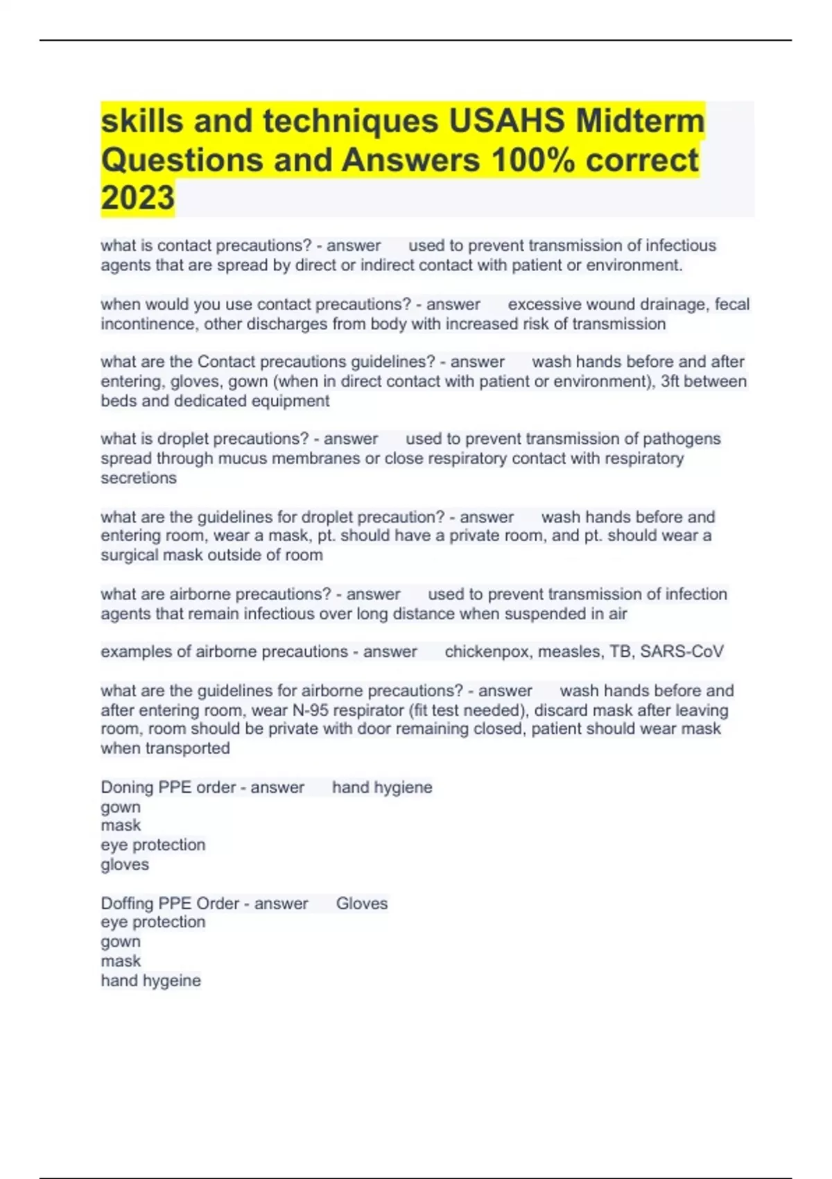 skills and techniques USAHS Midterm Questions and Answers 100% correct 2023 what is contact precautions? used to prevent transmission of infectious agents that are spread by direct or indirect contact with patient or environment. when would you use contact precautions? excessive wound drainage, fecal incontinence, other discharges from body with increased risk of transmission what are the Contact precautions guidelines? wash hands before and after entering, gloves, gown (when in direct contact with patient or environment), 3ft between beds and dedicated equipment what is droplet precautions? used to prevent transmission of pathogens spread through mucus membranes or close respiratory contact with respiratory secretions what are the guidelines for droplet precaution? wash hands before and entering room, wear a mask, pt. should have a private room, and pt. should wear a surgical mask outside of room what are airborne precautions? used to prevent transmission of infection agents that remain infectious over long distance when suspended in air examples of airborne precautions chickenpox, measles, TB, SARS-CoV what are the guidelines for airborne precautions? wash hands before and after entering room, wear N-95 respirator (fit test needed), discard mask after leaving room, room should be private with door remaining closed, patient should wear mask when transported Doning PPE order hand hygiene gown mask eye protection gloves Doffing PPE Order Gloves eye protection gown mask hand hygeine Which cushion is the lowest cost, and has firm support? standard foam Which cushion is best to use in combination with the standard foam? Gel or memory foam the standard foam is best for individuals with low risk of...... developing pressure sores which cushion is primarily used for support and positioning? standard foam which cushion is supportive and pliable that moves with used but keeps them in place? Gel Which cushion is best used in cased of advanced skin breakdown and/or for bariatric users? Gel+Foam which cushion prevents the patient from leaning? wedge/positioning How would you position a wedge cushion to prevent the patient from leaning forward or slouching? High posterior and low anterior Which cushion is the best for patients with decreased sensation or history of pressure sores? ROHO Which cushion would you choose for a 28-year old male who sustained a SCI at the T-12 level and has lack of sensation and motor control from waist-level down? ROHO Which cushion would you choose for a 55-year old female in early stage of MS who has poor upright posture and increased forward shoulders and thoracic kyphosis? wedge/positioning which cushion would you choose for a 62-year old female with diabetes mellitus and obesity and is developing stage II pressure ulcers on bilateral ischial tuberosities? gel cushion which cushion would you choose for a 78-year old female recovering from a UTI after staying at the hospital for 1 week with no other underlying conditions? Standard foam The wheel chair ________ sometimes require an extension to allow caregivers to maintain a more upright position when transporting hand grips/push handles _______ aid in safety, pressure reduction and position for a wheelchair user armrest pads ______help balance and contain the user in the wheelchair armrests when transferring a patient, a ______ is typically removed to create an unobstructed transfer plane. side panel the wheelchair seat width is usually the measurement of the ______ between the arm rests seat upholstery the ______ is sometimes outfitted with straps to help users maintain an upright position when appropriate wheelchair back upholstery to make transfers easier____ are usually removable and swing away riggings a _____ that is too high or too low can cause discomfort and can put more pressure on your joints footplate wheelchair caster wheels are mounted to a _____ assembly caster fork the ________ swivel in all directions to improve your wheelchairs maneuverability front casters the ____ are two of the four points of the wheelchair that come in contact with the environment and they are the instrument through which independent manual mobility happens rear wheels a _____ on the rear wheels help protect the nuts and bolts of the wheel and maintain its integrity and safety cap hub the most common type of wheelchair______ are called the push/pull lock brakes what can too narrow of a wheelchair cause? restriction and pressure on greater trochanters what problems can occur is a wheelchair is too wide? hard to drive and navigate What is the ideal width of a wheel chair? one finger width between hip and wheelchair side what is the ideal depth/length of a wheelchair two finger widths from back of the knee what are some problems when the wheelchair is too deep/too long? creates pressure on the popliteal fold and causes pressure behind the leg and cuts off circulation causing a risk to skin integrity. Also causes the patient to slouch forward. what are some problems when the wheelchair is too narrow/too short? creates a feeling of instability for the patient and increase risk of pt falling out of the chair. causes the pt. to push pack in the chair causing more pressure on ischial tuberosity. what are some problems when the leg rest is too long? feet push down and causes pressure areas on the back of the femurs what are some problems when leg rests are too high? it causes bending of the legs and puts pressure on the ischial tuberosities what are some problems when the arm height is too high? causes the scapula to elevate and makes it harder for the pt to reach around the armrest to get to the driver rim or drive wheel what are some problems when the arm height is too low? depresses the scapula and makes it uncomfortable in the shoulder area. creates a lack of support for the arms to sit comfortably what are some problems when the back upholstery is too high? pt may not be able to propel the wheelchair because they are hitting arms again