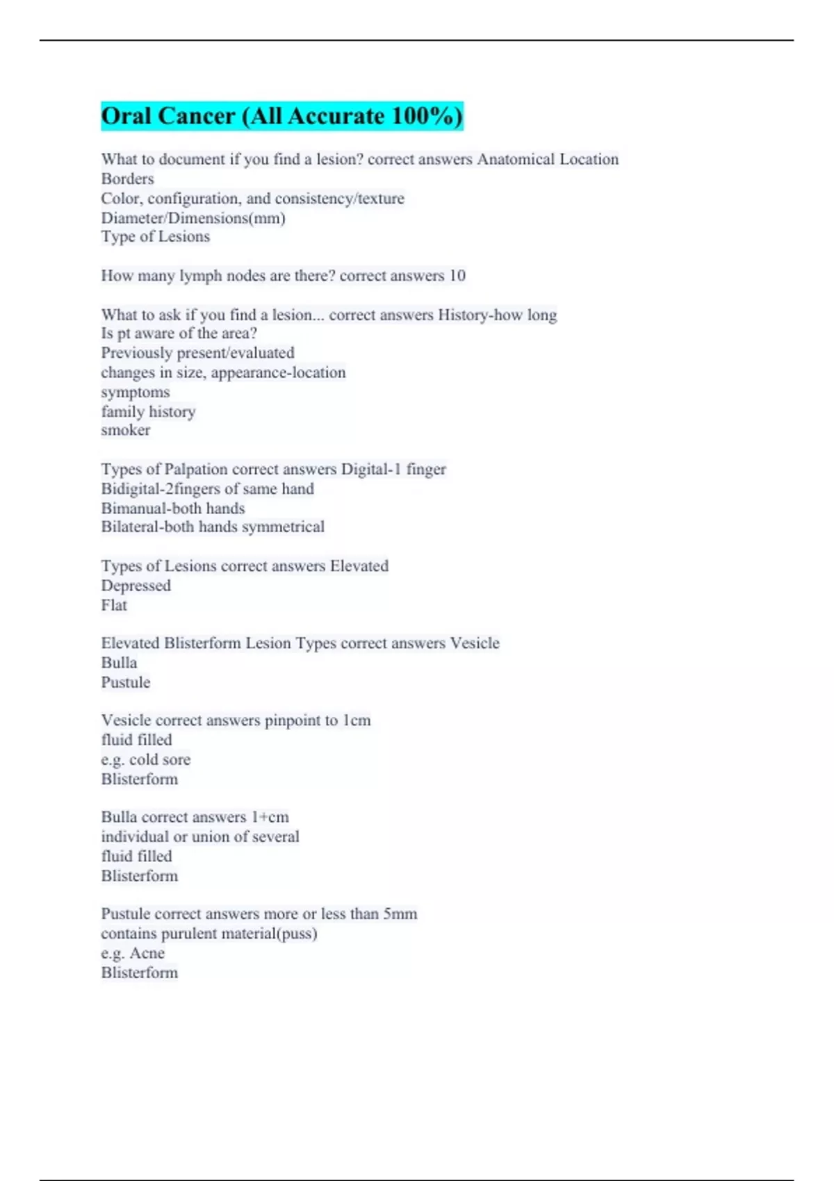 What to document if you find a lesion? correct answers Anatomical Location Borders Color, configuration, and consistency/texture Diameter/Dimensions(mm) Type of Lesions How many lymph nodes are there? correct answers 10 What to ask if you find a lesion... correct answers History-how long Is pt aware of the area? Previously present/evaluated changes in size, appearance-location symptoms family history smoker Types of Palpation correct answers Digital-1 finger Bidigital-2fingers of same hand Bimanual-both hands Bilateral-both hands symmetrical Types of Lesions correct answers Elevated Depressed Flat Elevated Blisterform Lesion Types correct answers Vesicle Bulla Pustule Vesicle correct answers pinpoint to 1cm fluid filled e.g. cold sore Blisterform Bulla correct answers 1+cm individual or union of several fluid filled Blisterform Pustule correct answers more or less than 5mm contains purulent material(puss) e.g. Acne Blisterform