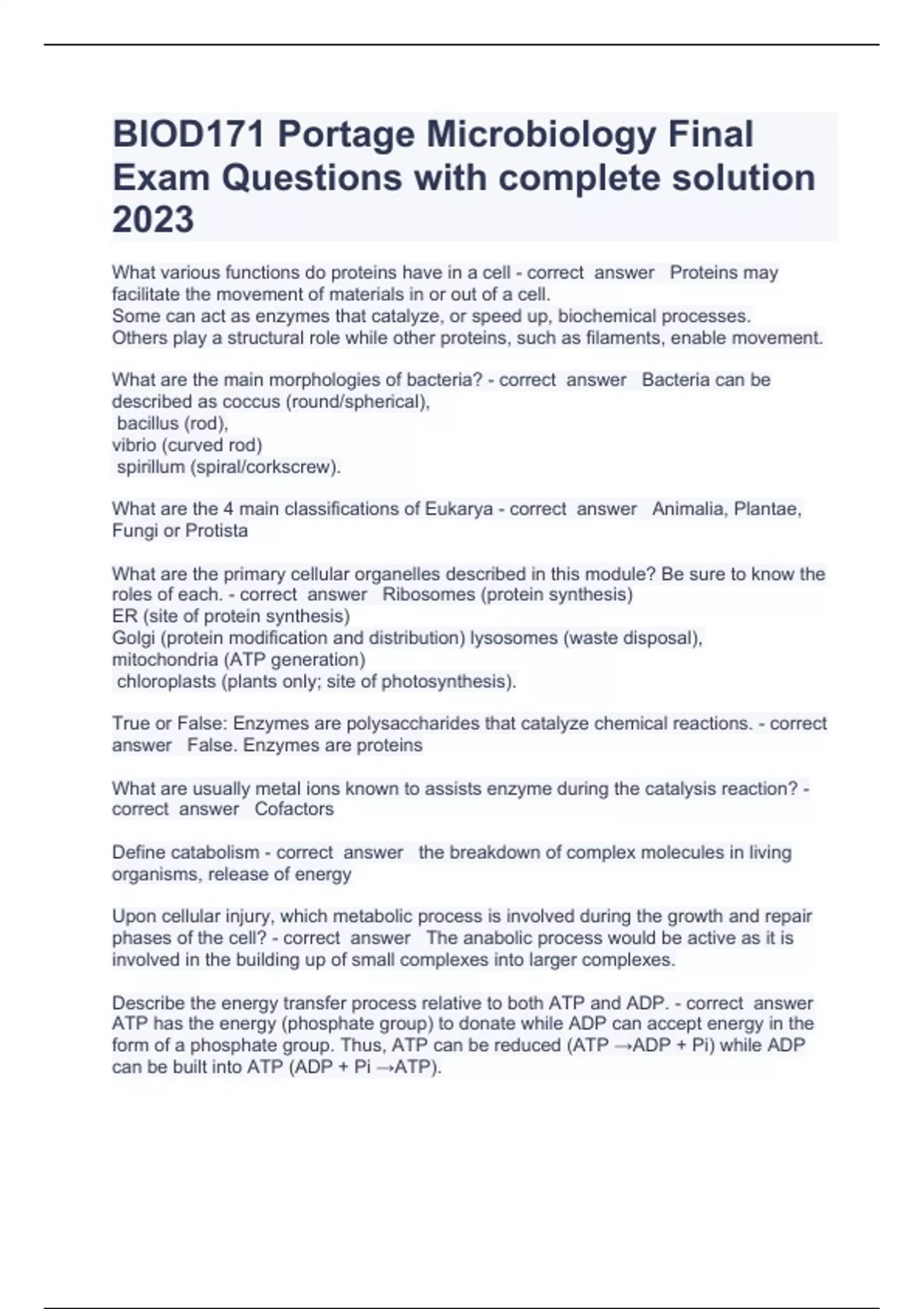 BIOD171 Portage Microbiology Final Exam Questions with complete solution 2023 What various functions do proteins have in a cell - correct answer Proteins may facilitate the movement of materials in or out of a cell. Some can act as enzymes that catalyze, or speed up, biochemical processes. Others play a structural role while other proteins, such as filaments, enable movement. What are the main morphologies of bacteria? - correct answer Bacteria can be described as coccus (round/spherical), bacillus (rod), vibrio (curved rod) spirillum (spiral/corkscrew). What are the 4 main classifications of Eukarya - correct answer Animalia, Plantae, Fungi or Protista What are the primary cellular organelles described in this module? Be sure to know the roles of each. - correct answer Ribosomes (protein synthesis) ER (site of protein synthesis) Golgi (protein modification and distribution) lysosomes (waste disposal), mitochondria (ATP generation) chloroplasts (plants only; site of photosynthesis). True or False: Enzymes are polysaccharides that catalyze chemical reactions. - correct answer False. Enzymes are proteins