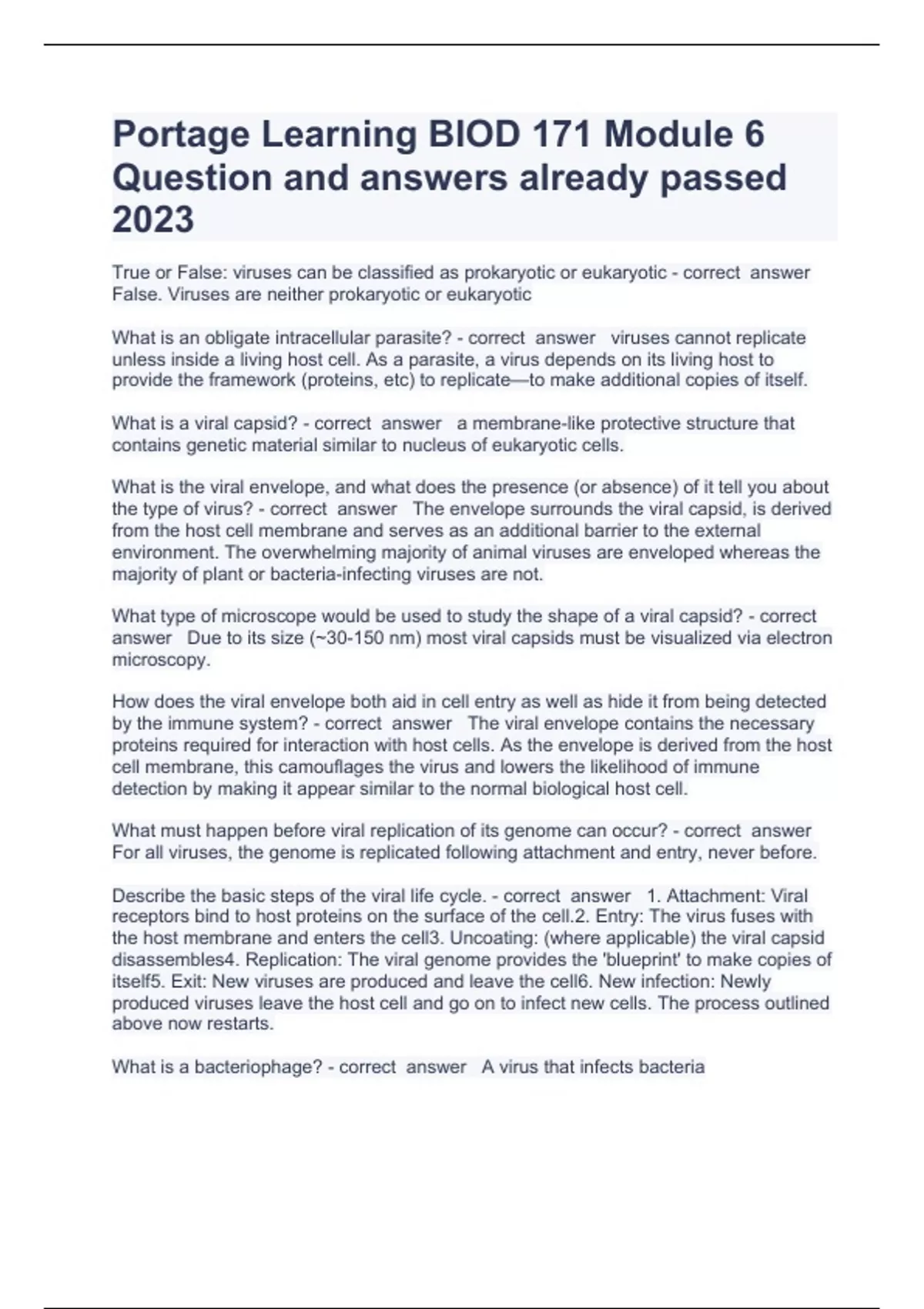 Portage Learning BIOD 171 Module 6 Question and answers already passed 2023 True or False: viruses can be classified as prokaryotic or eukaryotic - correct answer False. Viruses are neither prokaryotic or eukaryotic What is an obligate intracellular parasite? - correct answer viruses cannot replicate unless inside a living host cell. As a parasite, a virus depends on its living host to provide the framework (proteins, etc) to replicate—to make additional copies of itself. What is a viral capsid? - correct answer a membrane-like protective structure that contains genetic material similar to nucleus of eukaryotic cells. What is the viral envelope, and what does the presence (or absence) of it tell you about the type of virus? - correct answer The envelope surrounds the viral capsid, is derived from the host cell membrane and serves as an additional barrier to the external environment. The overwhelming majority of animal viruses are enveloped whereas the majority of plant or bacteria-infecting viruses are not. What type of microscope would be used to study the shape of a viral capsid? - correct answer Due to its size (~30-150 nm) most viral capsids must be visualized via electron microscopy. How does the viral envelope both aid in cell entry as well as hide it from being detected by the immune system? - correct answer The viral envelope contains the necessary proteins required for interaction with host cells. As the envelope is derived from the host cell membrane, this camouflages the virus and lowers the likelihood of immune detection by making it appear similar to the normal biological host cell. What must happen before viral replication of its genome can occur? - correct answer For all viruses, the genome is replicated following attachment and entry, never before.