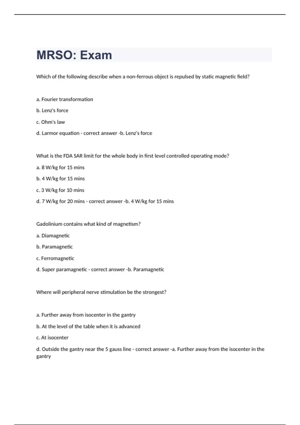 Which of the following describe when a non-ferrous object is repulsed by static magnetic field? a. Fourier transformation b. Lenz's force c. Ohm's law d. Larmor equation b. Lenz's force What is the FDA SAR limit for the whole body in first level controlled operating mode? a. 8 W/kg for 15 mins b. 4 W/kg for 15 mins c. 3 W/kg for 10 mins d. 7 W/kg for 20 mins b. 4 W/kg for 15 mins Gadolinium contains what kind of magnetism? a. Diamagnetic b. Paramagnetic c. Ferromagnetic d. Super paramagnetic b. Paramagnetic Where will peripheral nerve stimulation be the strongest? a. Further away from isocenter in the gantry b. At the level of the table when it is advanced c. At isocenter d. Outside the gantry near the 5 gauss line a. Further away from the isocenter in the gantry What is the name for the direction of the vector of the static magnetic field? a. Inverse field b. Equilibrium c. B0 d. B1 c. B0 An object that produces a weakly repulsive force in the presence of a strong magnetic field is called what? a. Superparamagnetic b. Ferromagnetic c. Diamagnetic d. Paramagnetic c. Diamagnetic The gradient coils are responsible for which of the following? Select all that apply. a. Heating b. Rotational force c. Translational force d. Magnetohydrodynamic effect e. Noise f. Peripheral nerve stimulation e. Noise f. Peripheral nerve stimulation Why is magnetic shielding used in an MR unit? a. To reduce heating b. To reduce the e-fields c. To maintain field homogeneity d. To limit the fringe field d. To limit the fringe field Contrast media will do what to our tissue? a. Shorten T1 relaxation times b. Shorten T1 & T2 relaxation times c. Increase T2 relaxation times and decrease T1 relaxation times d. Shorten T2 relaxation times b. Shorten T1 & T2 relaxation times