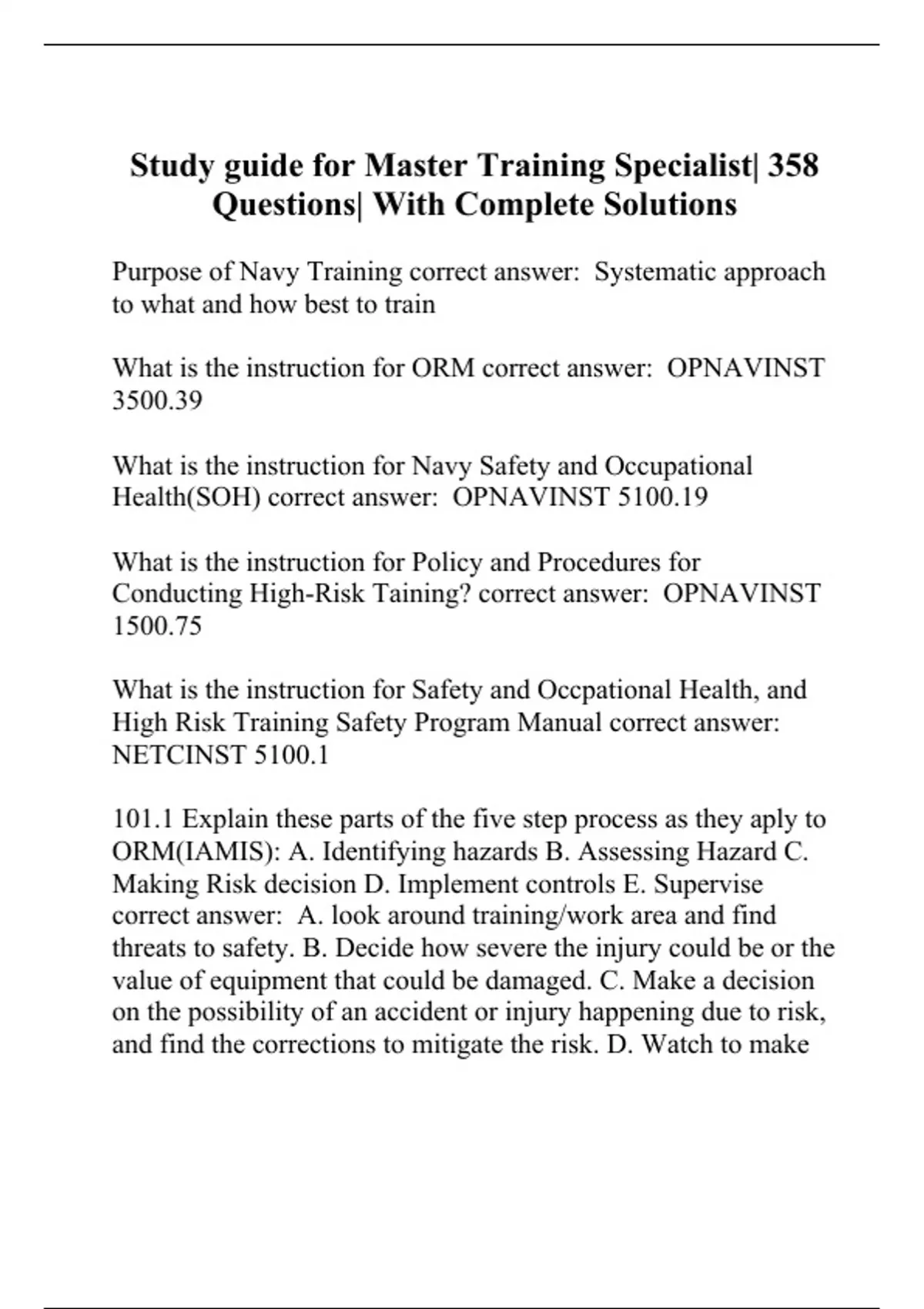 Purpose of Navy Training correct answer: Systematic approach to what and how best to train What is the instruction for ORM correct answer: OPNAVINST 3500.39 What is the instruction for Navy Safety and Occupational Health(SOH) correct answer: OPNAVINST 5100.19 What is the instruction for Policy and Procedures for Conducting High-Risk Taining? correct answer: OPNAVINST 1500.75 What is the instruction for Safety and Occpational Health, and High Risk Training Safety Program Manual correct answer: NETCINST 5100.1 101.1 Explain these parts of the five step process as they aply to ORM(IAMIS): A. Identifying hazards B. Assessing Hazard C. Making Risk decision D. Implement controls E. Supervise correct answer: A. look around training/work area and find threats to safety. B. Decide how severe the injury could be or the value of equipment that could be damaged. C. Make a decision on the possibility of an accident or injury happening due to risk, and find the corrections to mitigate the risk. D. Watch to make sure the corrections are implemented. E. Monitoring and oversight of training/work process. .2 Complete a risk assessment of a course(high risk instructor only) correct answer: A. Ice on side-wa