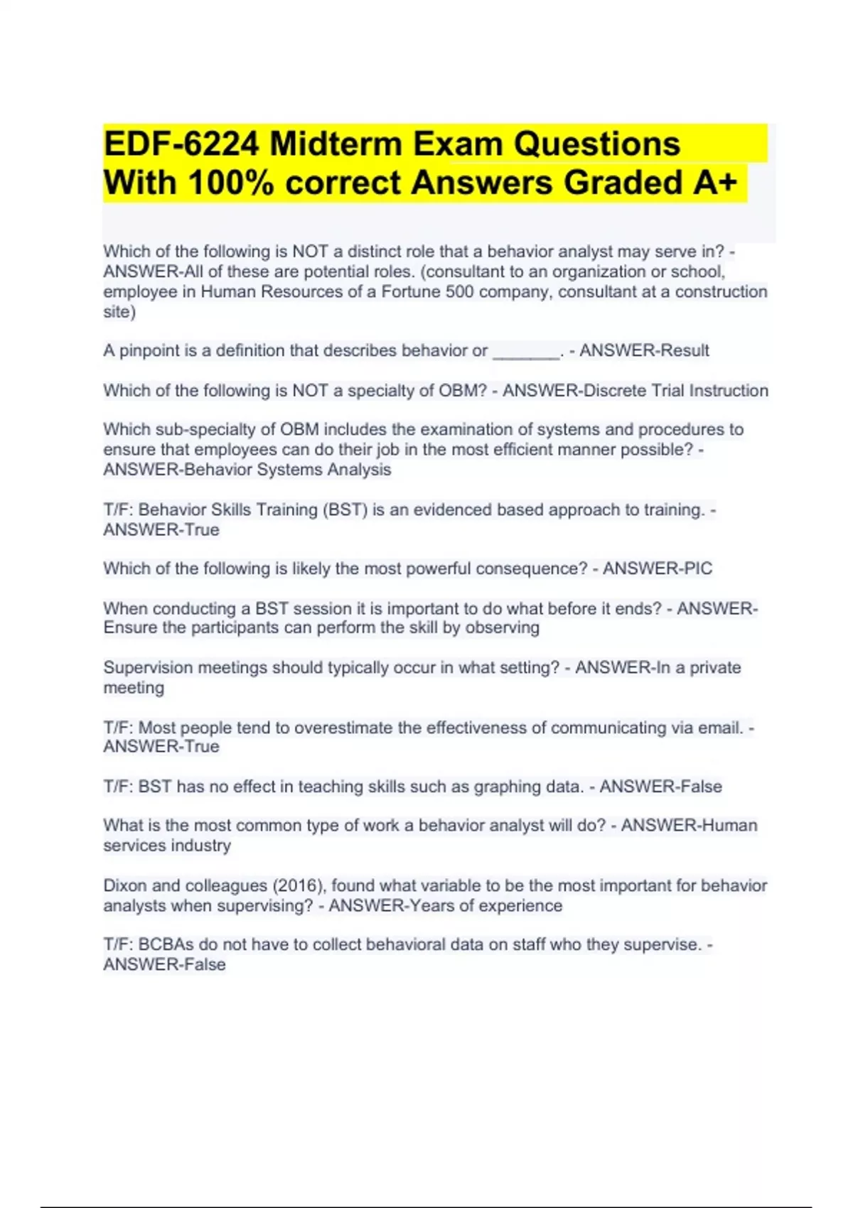 EDF-6224 Midterm Exam Questions With 100% correct Answers Graded A+. Which of the following is NOT a distinct role that a behavior analyst may serve in? - ANSWER-All of these are potential roles. (consultant to an organization or school, employee in Human Resources of a Fortune 500 company, consultant at a construction site) A pinpoint is a definition that describes behavior or _______. - ANSWER-Result Which of the following is NOT a specialty of OBM? - ANSWER-Discrete Trial Instruction Which sub-specialty of OBM includes the examination of systems and procedures to ensure that employees can do their job in the most efficient manner possible? - ANSWER-Behavior Systems Analysis T/F: Behavior Skills Training (BST) is an evidenced based approach to training. - ANSWER-True Which of the following is likely the most powerful consequence? - ANSWER-PIC When conducting a BST session it is important to do what before it ends? - ANSWEREnsure the participants can perform the skill by observing Supervision meetings should typically occur in what setting? - ANSWER-In a private meeting T/F: Most people tend to overestimate the effectiveness of communicating via email. - ANSWER-True T/F: BST has no effect in teaching skills such as graphing data. - ANSWER-False What is the most common type of work a behavior analyst will do? - ANSWER-Human services industry Dixon and colleagues (2016), found what variable to be the most important for behavior analysts when supervising? - ANSWER-Years of experience T/F: BCBAs do not have to collect behavioral data on staff who they supervise. - ANSWER-False