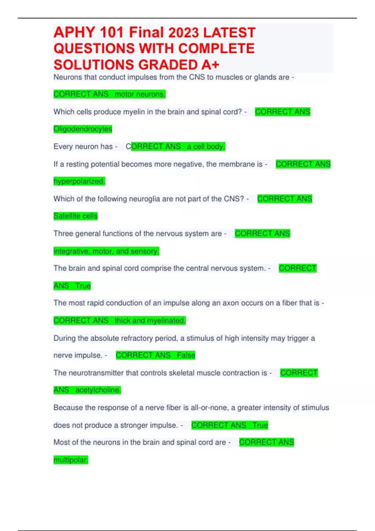Neurons that conduct impulses from the CNS to muscles or glands are - CORRECT ANS motor neurons. Which cells produce myelin in the brain and spinal cord? - CORRECT ANS Oligodendrocytes Every neuron has - CORRECT ANS a cell body. If a resting potential becomes more negative, the membrane is - CORRECT ANS hyperpolarized. Which of the following neuroglia are not part of the CNS? - CORRECT ANS Satellite cells Three general functions of the nervous system are - CORRECT ANS integrative, motor, and sensory. The brain and spinal cord comprise the central nervous system. - CORRECT ANS True The most rapid conduction of an impulse along an axon occurs on a fiber that is - CORRECT ANS thick and myelinated. During the absolute refractory period, a stimulus of high intensity may trigger a nerve impulse. - CORRECT ANS False The neurotransmitter that controls skeletal muscle contraction is - CORRECT ANS acetylcholine. Because the response of a nerve fiber is all-or-none, a greater intensity of stimulus does not produce a stronger impulse. - CORRECT ANS True Most of the neurons in the brain and spinal cord are - CORRECT ANS multipolar. Action potentials are related to impulses conducted along an axon in that - CORRECT ANS propagation of a series of action potentials along a nerve cell fiber constitutes an impulse. The simplest level of CNS function is the - CORRECT ANS spinal reflex. The ___________ separates the cerebrum from the cerebellum. - CORRECT ANS transverse fissure Gray matter of the spinal cord is mostly composed of - CORRECT ANS interneurons. Over a lifetime, the brain shrinks by about ___ percent. - CORRECT ANS 10 The meninges consist of - CORRECT ANS the pia mater, arachnoid mater, and dura mater. Which lobe of your brain are you using when you answer this question? - CORRECT ANS Frontal The ____________ is the thin meninx attached to the surface of the brain, containing many nerves and blood vessels. - CORRECT ANS pia mater The part of the brain that coordinates voluntary muscular movements is the - CORRECT ANS cerebellum. Cerebrospinal fluid - CORRECT ANS all of the above. The part of the brain that assigns value to a memory is the - CORRECT ANS amygdala. The dura mater is the outermost layer