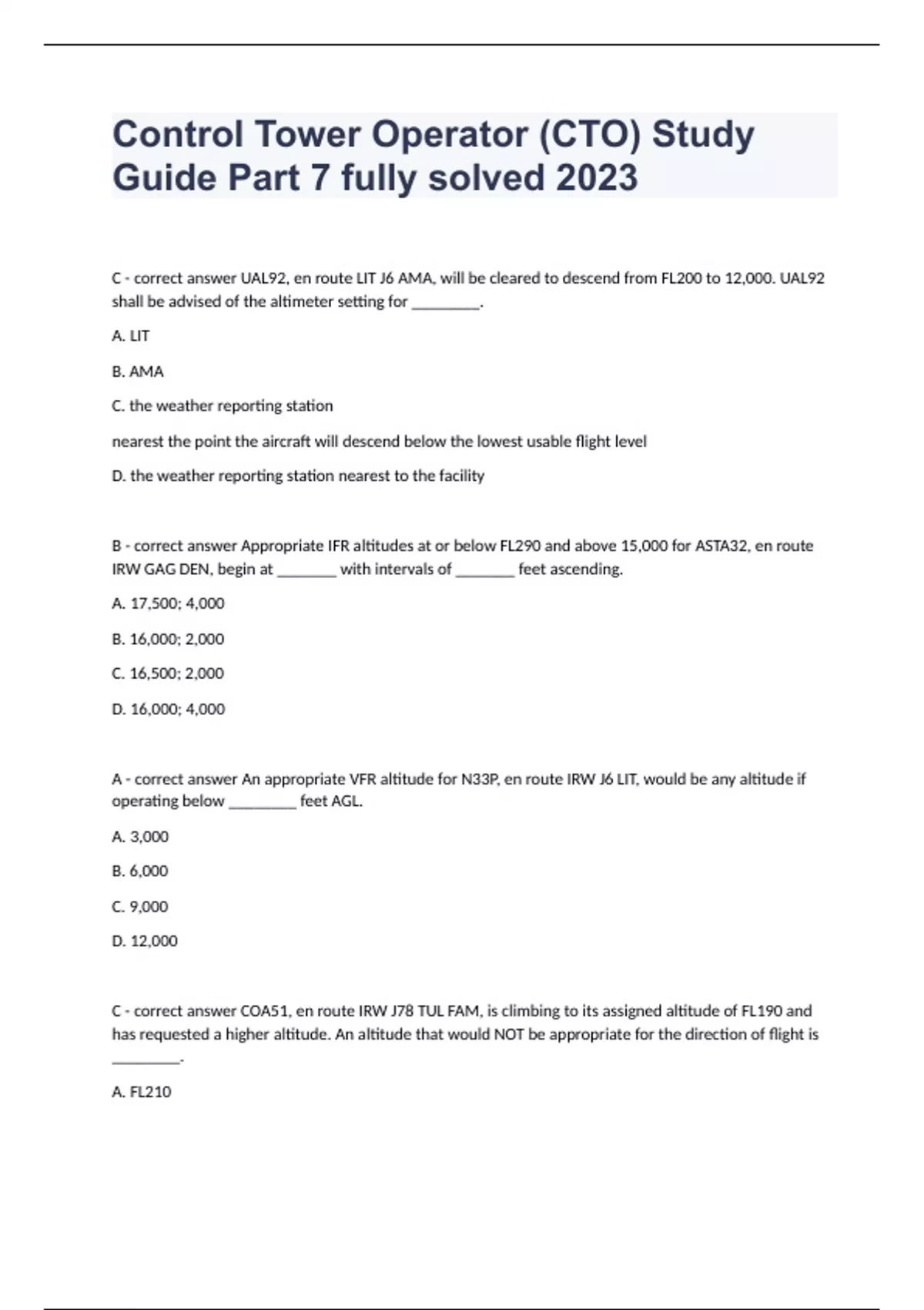 Control Tower Operator (CTO) Study Guide Part 7 fully solved 2023C - correct answer UAL92, en route LIT J6 AMA, will be cleared to descend from FL200 to 12,000. UAL92 shall be advised of the altimeter setting for ________. A. LIT B. AMA C. the weather reporting station nearest the point the aircraft will descend below the lowest usable flight level D. the weather reporting station nearest to the facility B - correct answer Appropriate IFR altitudes at or below FL290 and above 15,000 for ASTA32, en route IRW GAG DEN, begin at _______ with intervals of _______ feet ascending. A. 17,500; 4,000 B. 16,000; 2,000 C. 16,500; 2,000 D. 16,000; 4,000 A - correct answer An appropriate VFR altitude for N33P, en route IRW J6 LIT, would be any altitude if operating below ________ feet AGL. A. 3,000 B. 6,000 C. 9,000 D. 12,000 C - correct answer COA51, en route IRW J78 TUL FAM, is climbing to its assigned altitude of FL190 and has requested a higher altitude. An altitude that would NOT be appropriate for the direction of flight is ________. A. FL210