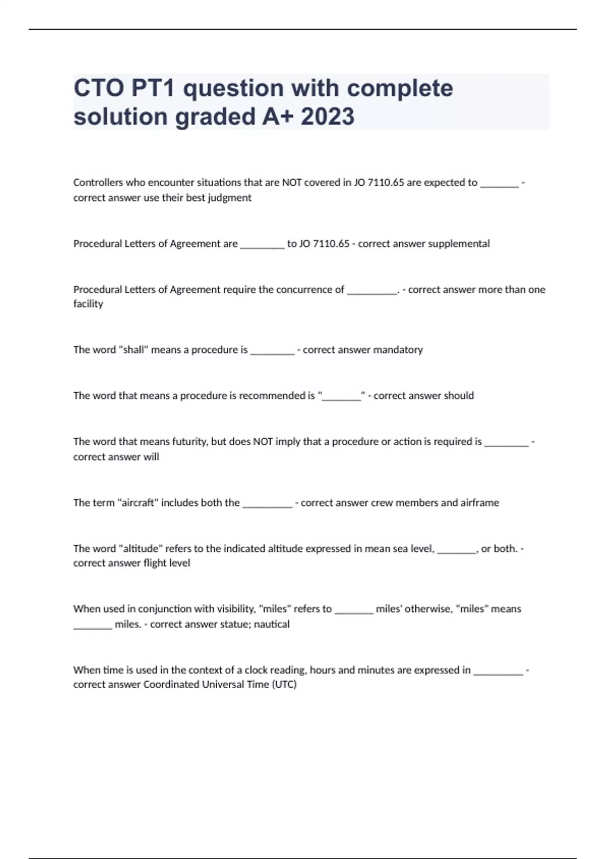CTO PT1 question with complete solution graded A+ 2023Controllers who encounter situations that are NOT covered in JO 7110.65 are expected to _______ - correct answer use their best judgment Procedural Letters of Agreement are ________ to JO 7110.65 - correct answer supplemental Procedural Letters of Agreement require the concurrence of _________. - correct answer more than one facility The word "shall" means a procedure is ________ - correct answer mandatory The word that means a procedure is recommended is "_______" - correct answer should The word that means futurity, but does NOT imply that a procedure or action is required is ________ - correct answer will The term "aircraft" includes both the _________ - correct answer crew members and airframe The word "altitude" refers to the indicated altitude expressed in mean sea level, _______, or both. - correct answer flight level When used in conjunction with visibility, "miles" refers to _______ miles' otherwise, "miles" means _______ miles. - correct answer statue; nautical When time is used in the context of a clock reading, hours and minutes are expressed in _________ - correct answer Coordinated Universal Time (UTC)